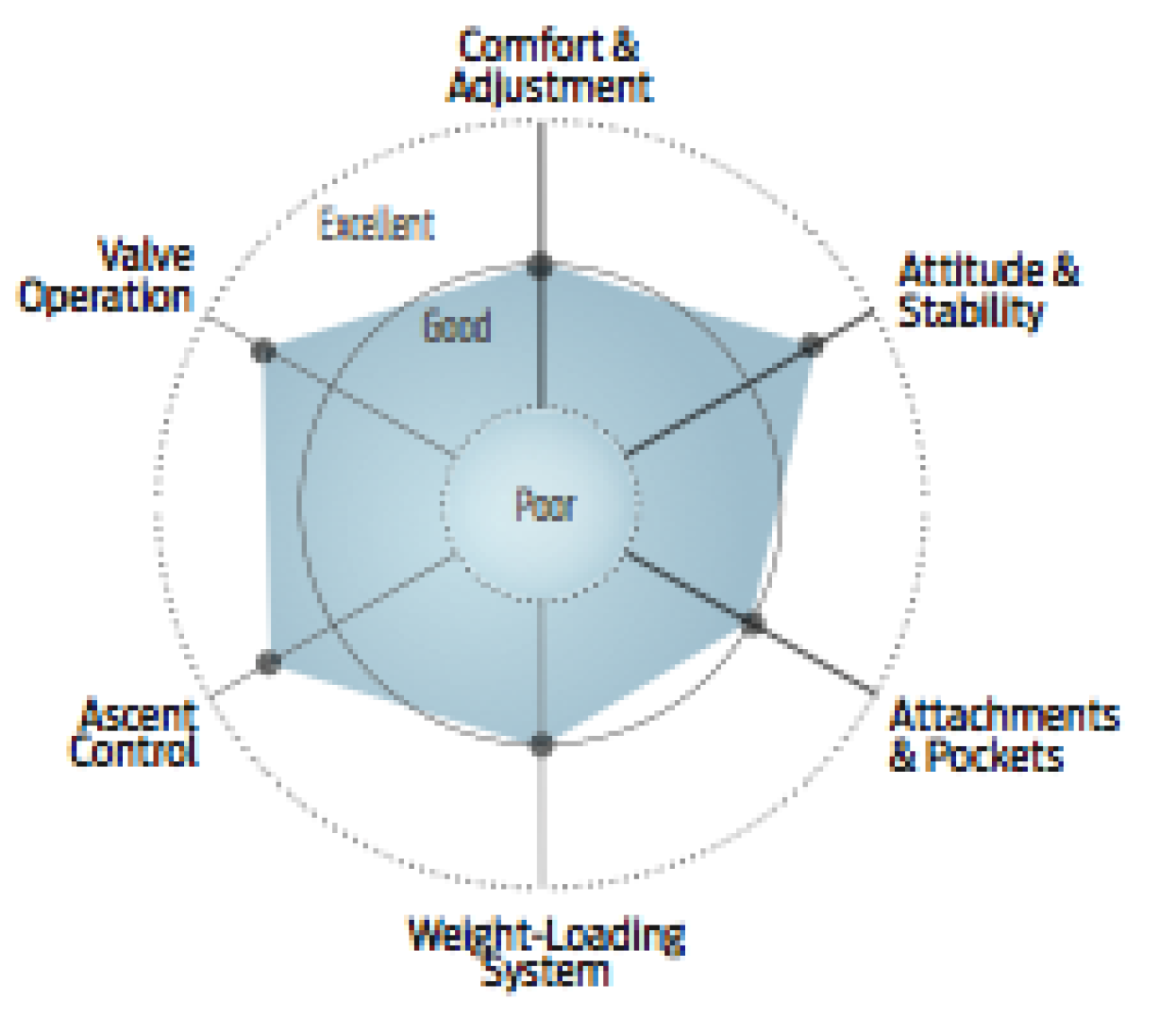 Designed for women, the Artemis weighs a hefty 9.5 pounds but features a shorter overall height and thicker padding on the back, hips and waist, which female testers said added a layer of comfort. Divers were split on the Angled Advanced Ballast Removal weight-pocket system, where a two-part clip on the BC secures the ditchable pouch’s strap and toggle. Though it could be difficult to re-engage the clip while underwater (if you need to add a pound or two to the weight pouch), it was very easy to release and provides an extra layer of security. Testers found two D-rings were oddly placed on the BC’s inner wall, though everyone liked the large, zippered storage pockets. Overall, testers found the Artemis performed well in most areas, receiving above-average marks for its inflator assembly and dump-valve operation.
