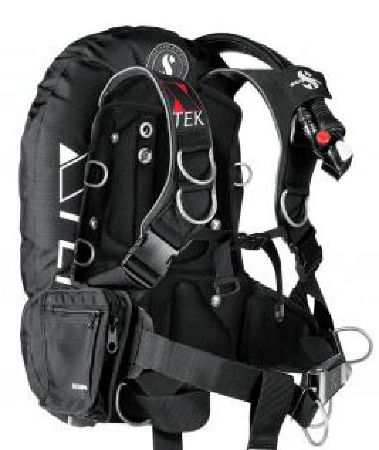 SCUBAPRO has designed the surprisingly comfortable Form Tek harness for double-tank configurations, though it can be converted for single-tank use. Sixty pounds of lift and a stainless-steel back plate make this harness an ideal foundation for serious technical diving. The three-piece system has every feature a tech¬ diver is looking for: a nylon outer shell and inner bladder; padded shoulders; an anatomically form-fitted back pad to support the lumbar area; quick-release, multi-adjustable shoulder buckles for easy removal and a snug fit and much more.
