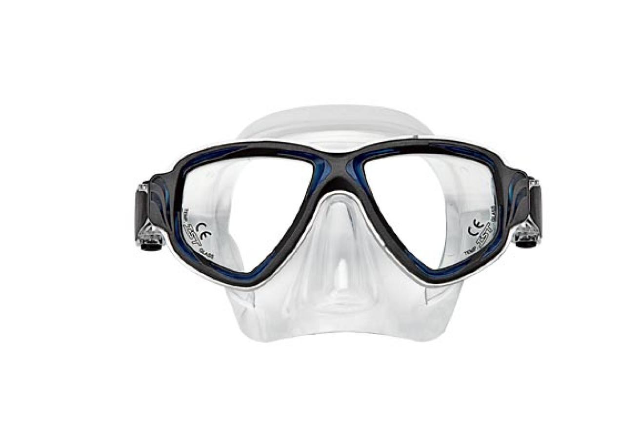 Built on the design of IST’s Panorama mask, the Synthesis also uses lightweight yet strong 6000-series aluminum for the frame, then adds plastic-injection construction for additional support. This provides a beefed-up, durable frame, and testers agreed the aluminum felt no heavier than a typical frame. In fact, the Synthesis’ weight is the same as many of the masks in this test. The Synthesis is easy to clear and equalize, and with buckles attached to the skirt, the close-to-the-eyes fit reduces internal volume, making equalization a snap. Travel and tec divers alike will appreciate the mask’s folding ability.