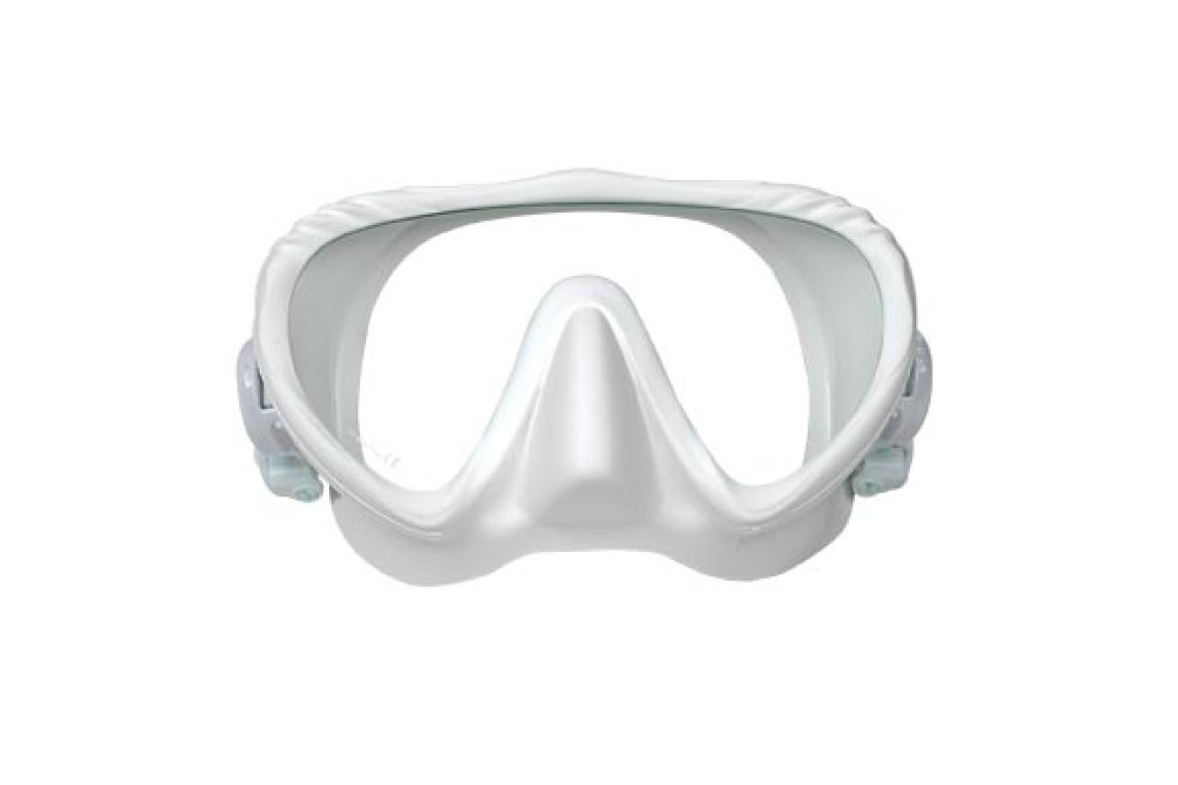 ScubaLab tested the Subgear Sprite’s frameless design in bright white silicone, with a fun floral design on the top of the skirt. A plain white silicone version is also available. Built for a smaller face, the Sprite is an extremely low- volume single-lens mask with a surprisingly comfortable and pliable silicone skirt. The Sprite had the second-best combined vertical-view FOV score, and offers an especially good downward view. Testers were able to clear and equalize the Sprite easily, and all appreciated the ease of adjustment of the buckles. Female testers loved the graphic design and, more important, the fit.