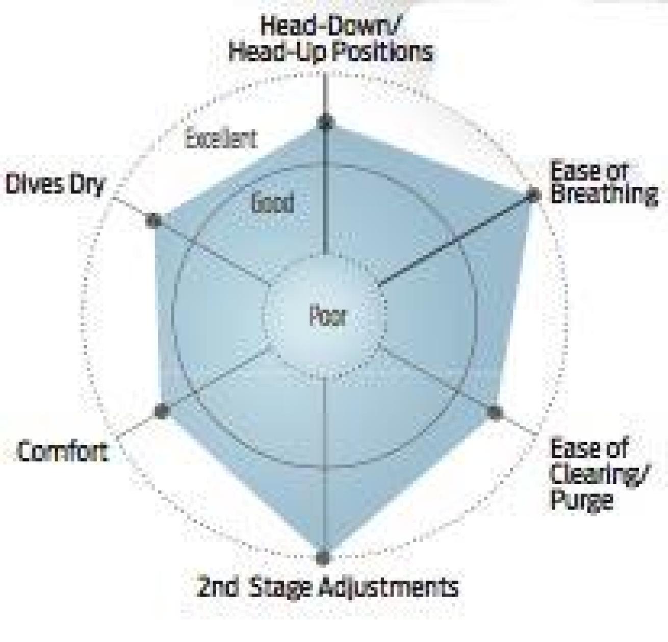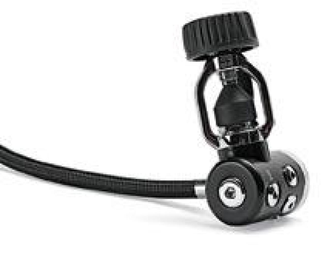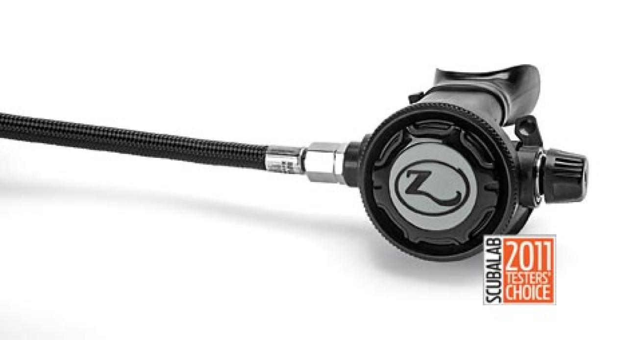 The Testers’ Choice in the $350 to $500 category, the Zeagle Onyx earned high marks in both simulated and real-world dives. The internal design of the first stage allows direct airflow to reduce turbulence and increase performance. Additional features include a high-flexibility braided LP hose, lightweight second stage and com- pact exhaust tee. The Zeagle tore through the lab tests, racking up excellent scores and consistent breathing efforts. During real-world tests, the only below-average comment from our testers was the inconvenient LP-port configuration, with the fifth port directly behind the diver’s neck. It was the only reg in its price range to average 4 or greater on all ergonomic tests, and the Onyx breathed well in all positions, was easy to purge, and the venturi lever and cracking pressure knob were easy to operate.