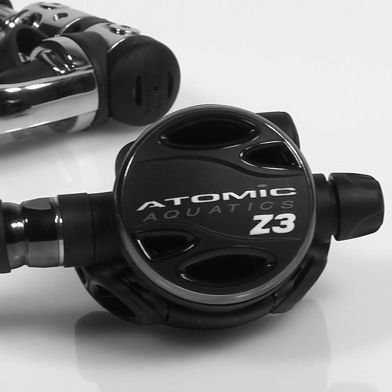 With the new Z3, Atomic combines high-‐performance design and smart material choices to create an affordable regulator with the ability to handle extreme dives. The Z3's piston first stage increases airflow for unrestricted breathing, especially when swimming hard or at greater depths, and is sealed and protected against freeze-‐ups in cold water. The Z3’s second stage is connected with a swivel, so it moves freely and rests comfortably in the diver’s mouth. A black PVD coating gives the swivel a sleek look and an added layer of protection. Inside the second stage, titanium/zirconium parts minimize weight and provide excellent corrosion resistance. Atomic’s Automatic Flow Control instantly tunes breathing resistance based on the depth changes that occur during any dive. The Bottom Line: Atomic’s Z3 combines advanced design and smartly sourced materials to give divers premium performance at a budget-‐friendly price.
