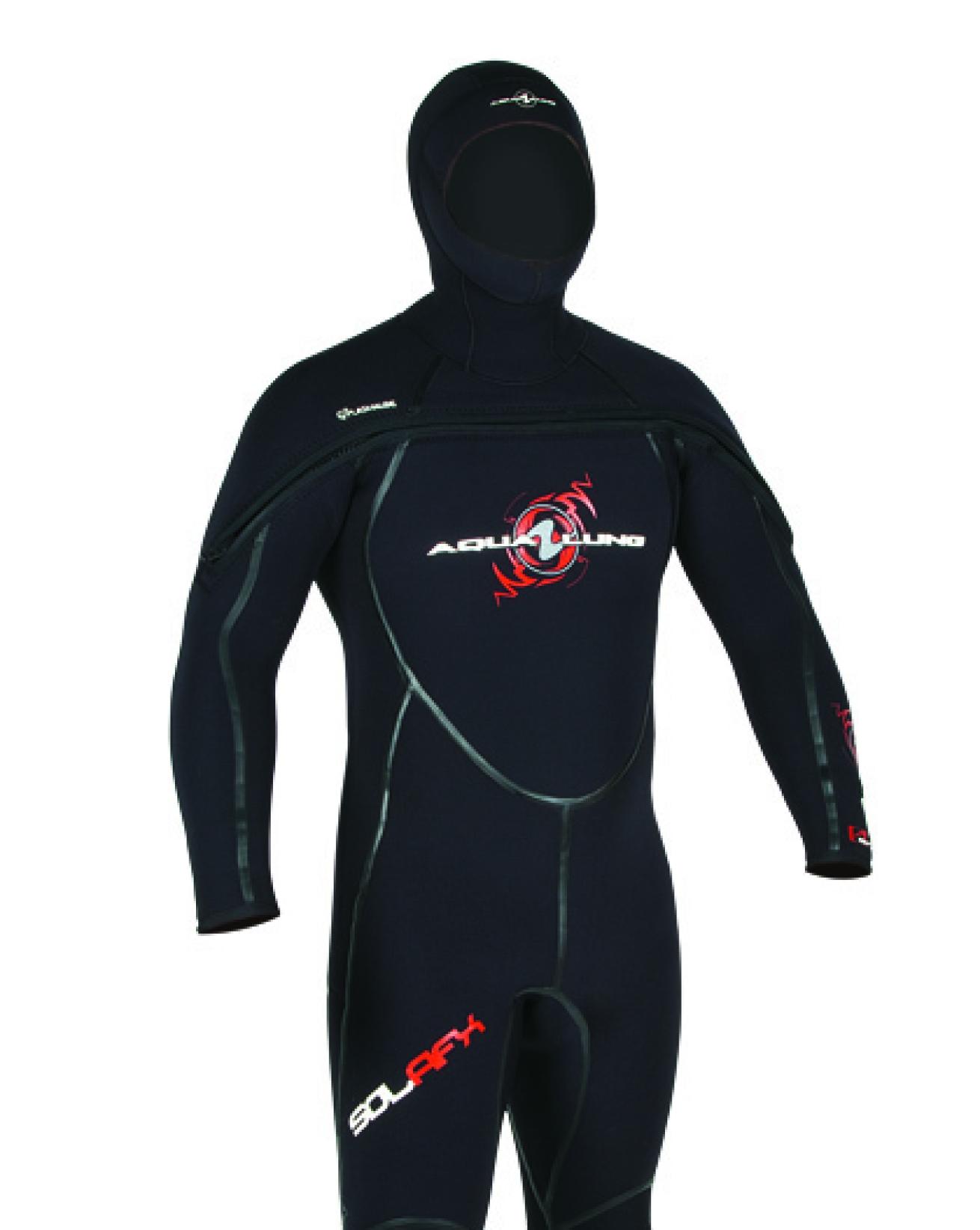 Utilizing Aqua Flex four-way stretch neoprene throughout, the Aqua Lung SolAfx packs 8 mm in the torso for heavy thermal protection to the core area and 7 mm in the arms and legs for enhanced flexibility on the surface and at depth. Featuring an attached hood that prevents cold water from entering at the neck and an across-the-chest “Plasmaloc” zipper that utilizes its design to increase water resistance, the SolAfx then adds a dam at the neck and shoulders to provide an additional level of warmth.