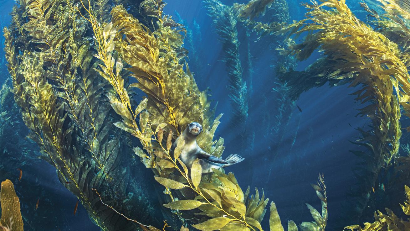 Alex MustardA lone sea lion playfully hides among the swaying stalks of a kelp forest.