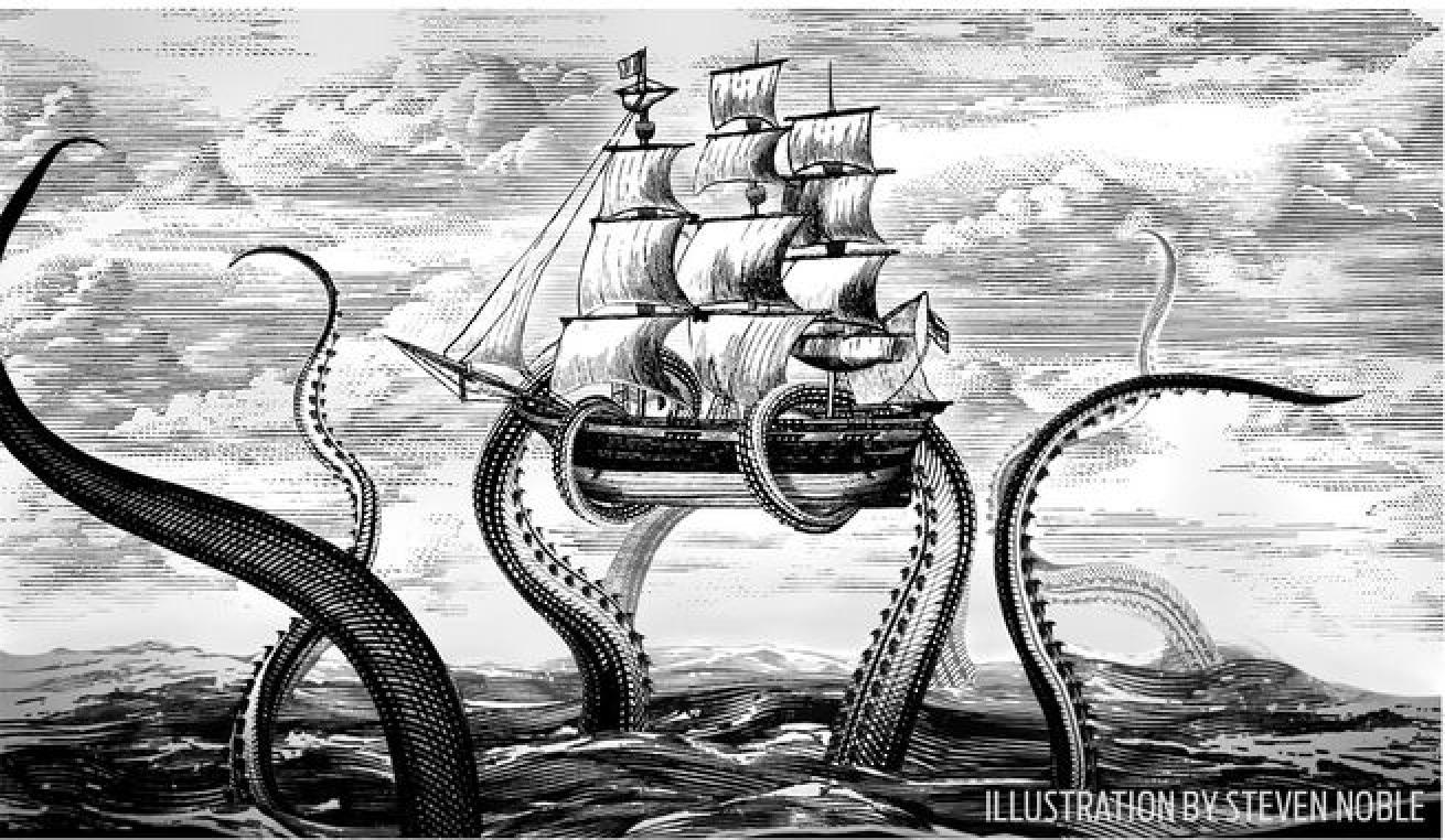 The kraken is from Norse mythology, a popular wellspring for science-fiction and fantasy-lit writers. In the first edition of Systema Naturae, a taxonomic classification of living organisms, Swedish botanist and zoologist Carl Linnaeus classified the kraken as a cephalopod (Microcosmus marinus). Though the creature was excluded from later editions, Linnaeus described it later as a “unique monster” that “is said to inhabit the seas of Norway,” though he admitted he had never seen one.
