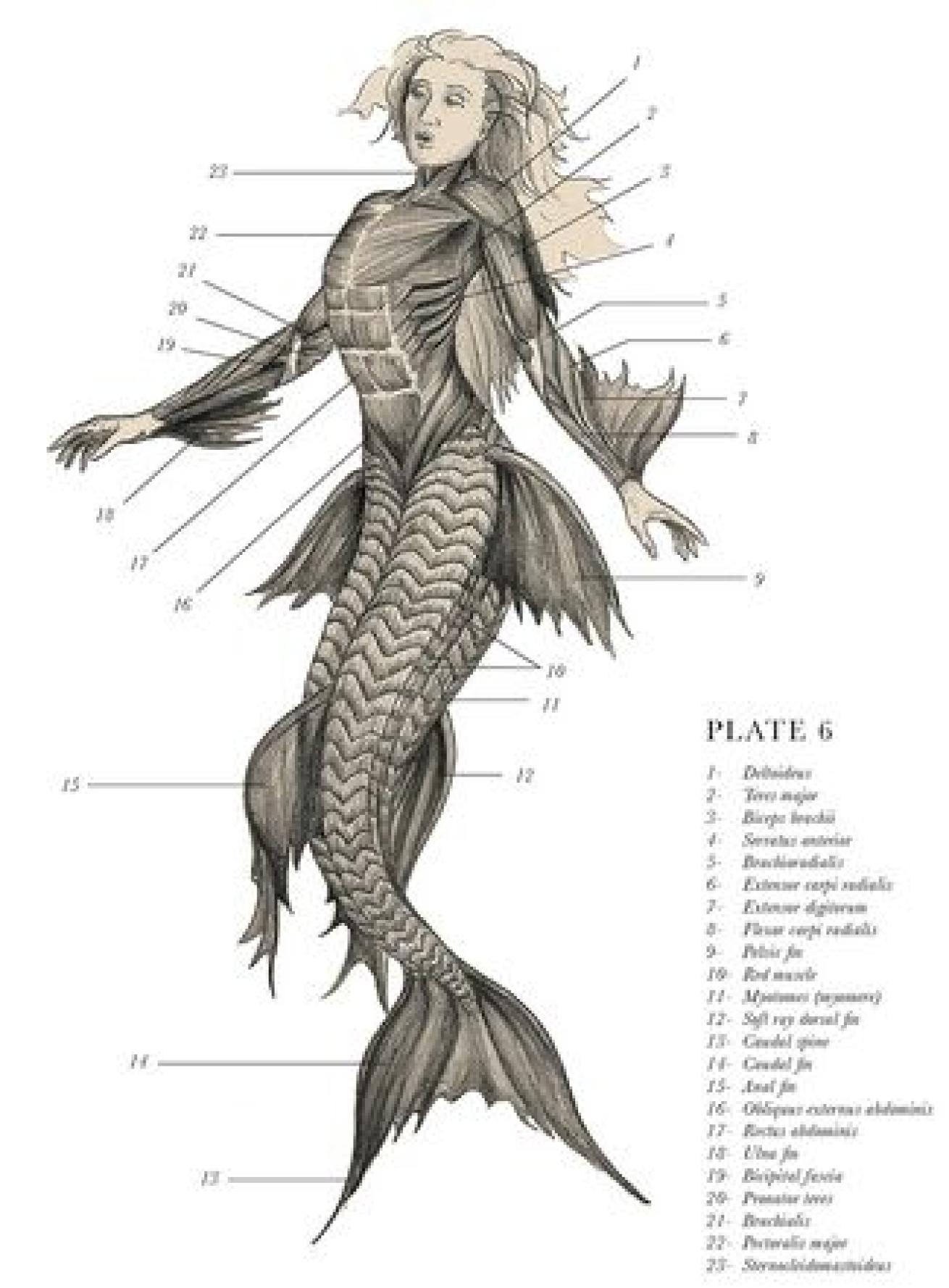 The second part of this book is a fictional magnum opus: The Codex Extinct Animalia, a Gray’s Anatomy for mythological creatures — like the mermaid above — all rendered in meticulous anatomical detail.