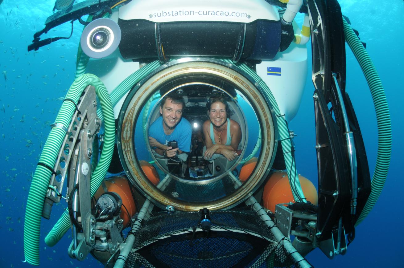 Substation CuracaoChris and Carrie are all smiles in Substation Curacao’s minisub, which takes visitors to frontier depths of 1,000 feet/305 meters.