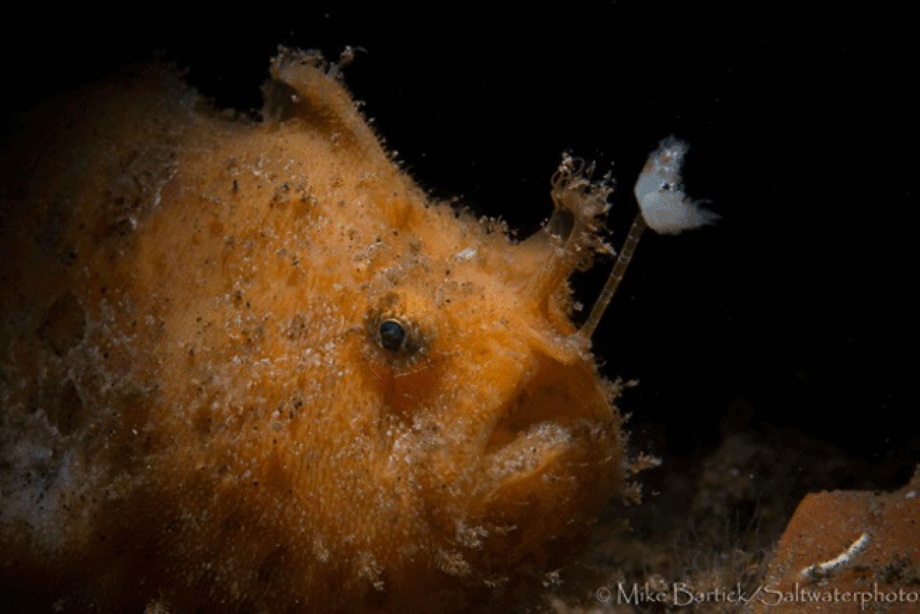 Frogfish (common name derived from Batrachoidiae or toadfish) are crafty predators that are well designed for ambushing their prey by using “lying and wait” hunting tactics and employing several strategies to atract heir prey without exerting too much energy. They rarely, if ever, swim while hunting, and assume a more stationary position. Frogfish are known for lightning fast strike speeds.