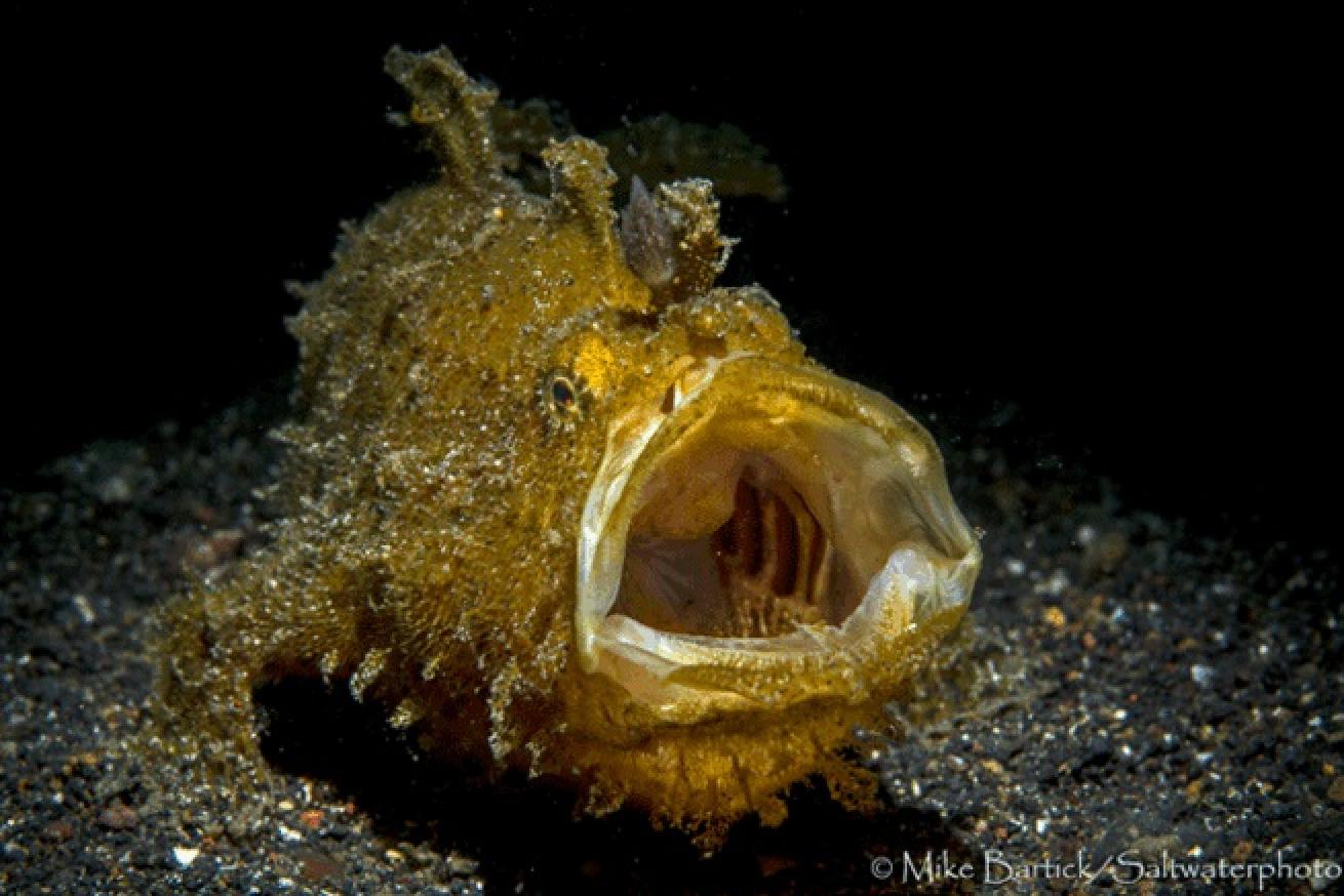 Thought to be a sign of stress or perhaps an attempt to make itself appear larger, an_ A.striatus_ shows me its massive, cavernous mouth. This is one of the key factors that make hairy frogfish a Holy Grail critter for underwater photographers and a favorite for me. Coupled with its other unique behaviors, this eloquent sophisticate is always at the top of my list.