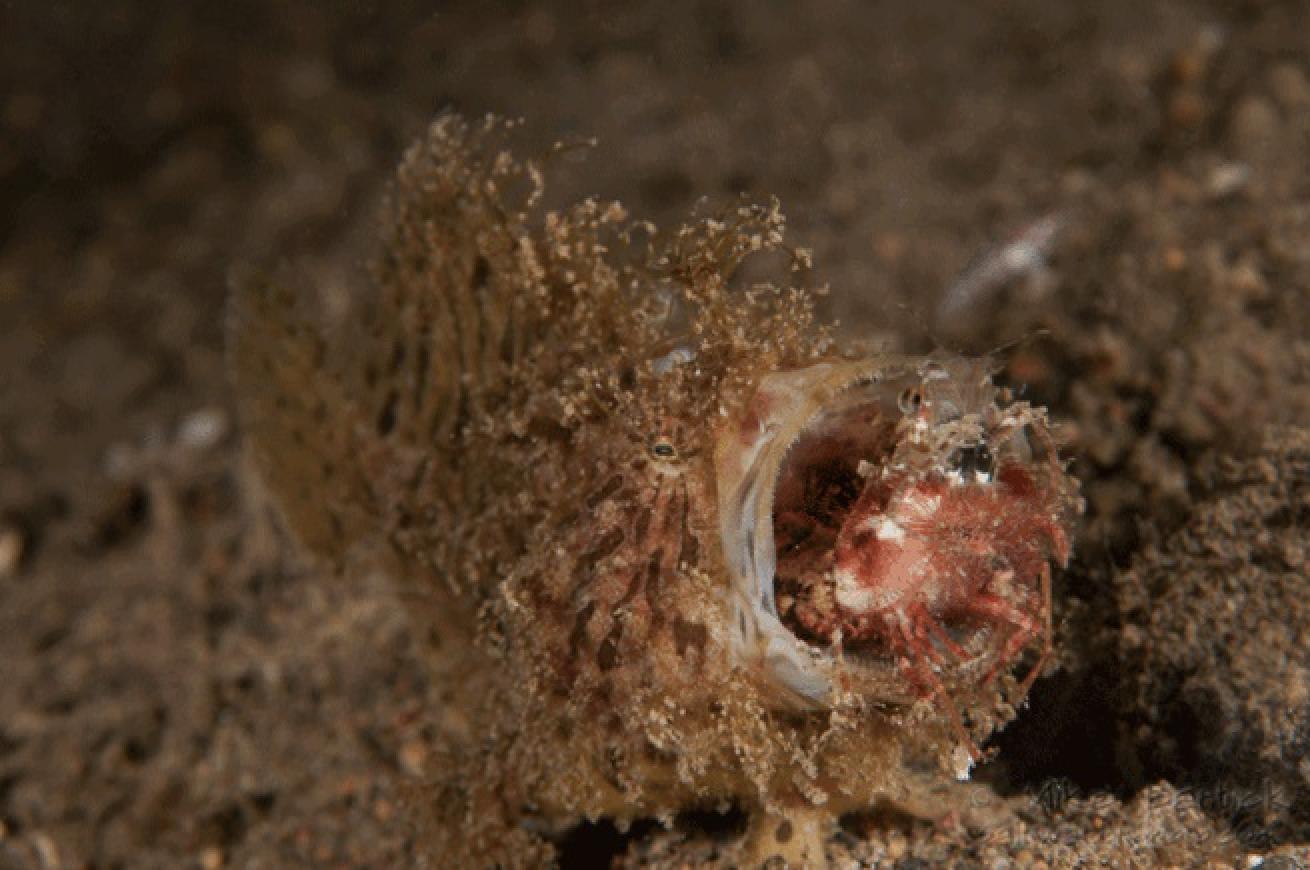 When hunting, hairy frogfish will position themselves in front of or above suspected burrows and dangle their bait. A gland near the lure also releases a chemical attractant to create a second form of stimulation to entice their prey. Another hunting tactic is hiding amongst spiny urchins with the lure extended upwards and launching attacks on cardinal fish. They even hunt while on the move on open sand, usually with the current coming from behind. This carries the released attractant as they trundle about on their walking pelvic fins, luring and snatching fish that enter or are caught in the strike zone.