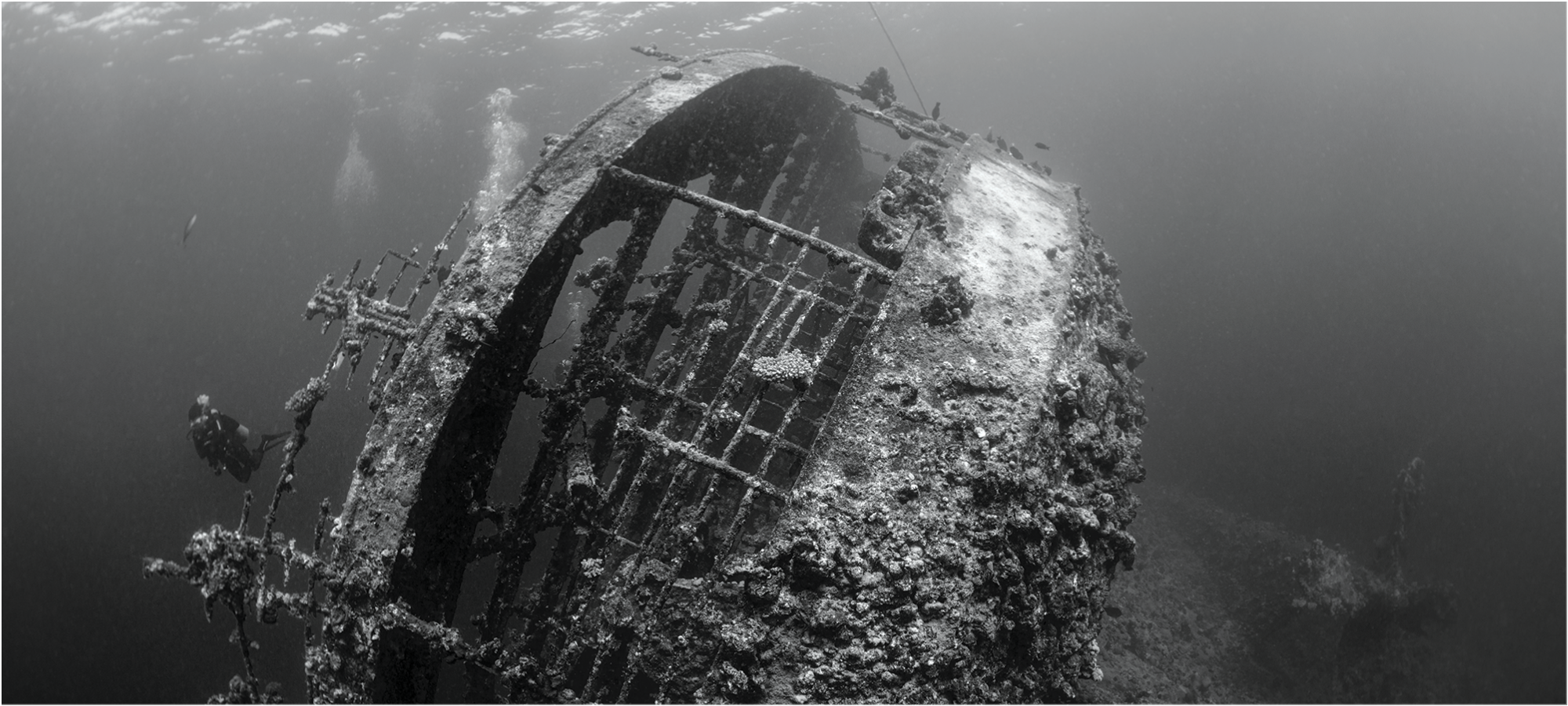 My dive group fins toward Muiesan’s wreckage through the hazy afternoon waters. The anchor line stretched from the ship promises the wreck is nearby, and I strain my eyes as we move forward.