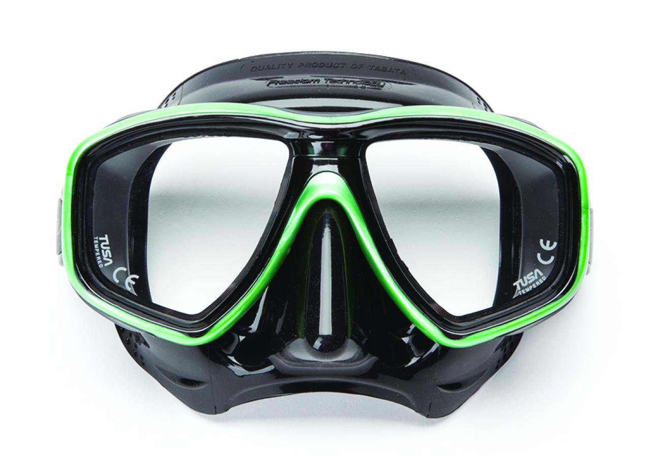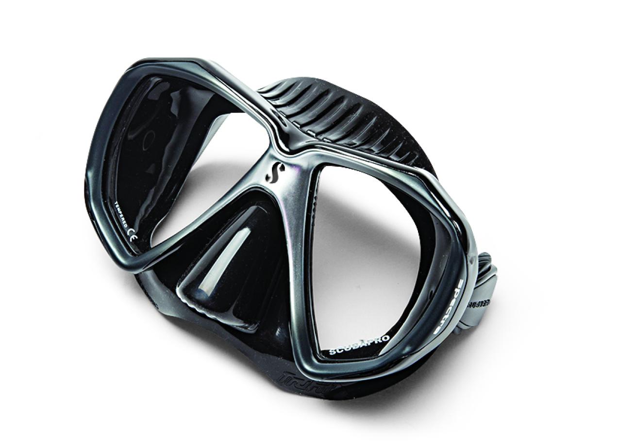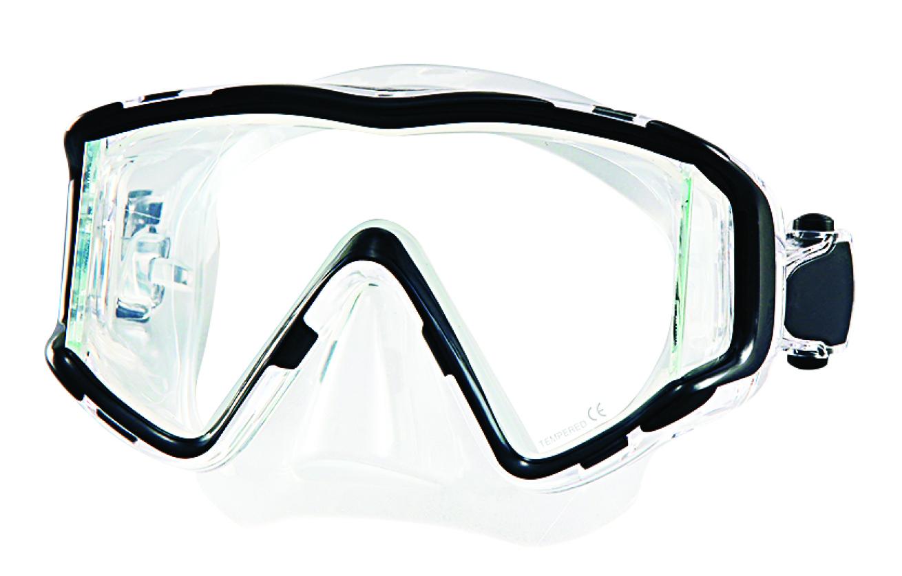 The huge, clear view a diver gets with this mask is due to the tempered- glass dual front lenses that are teamed with a pair of side lenses.