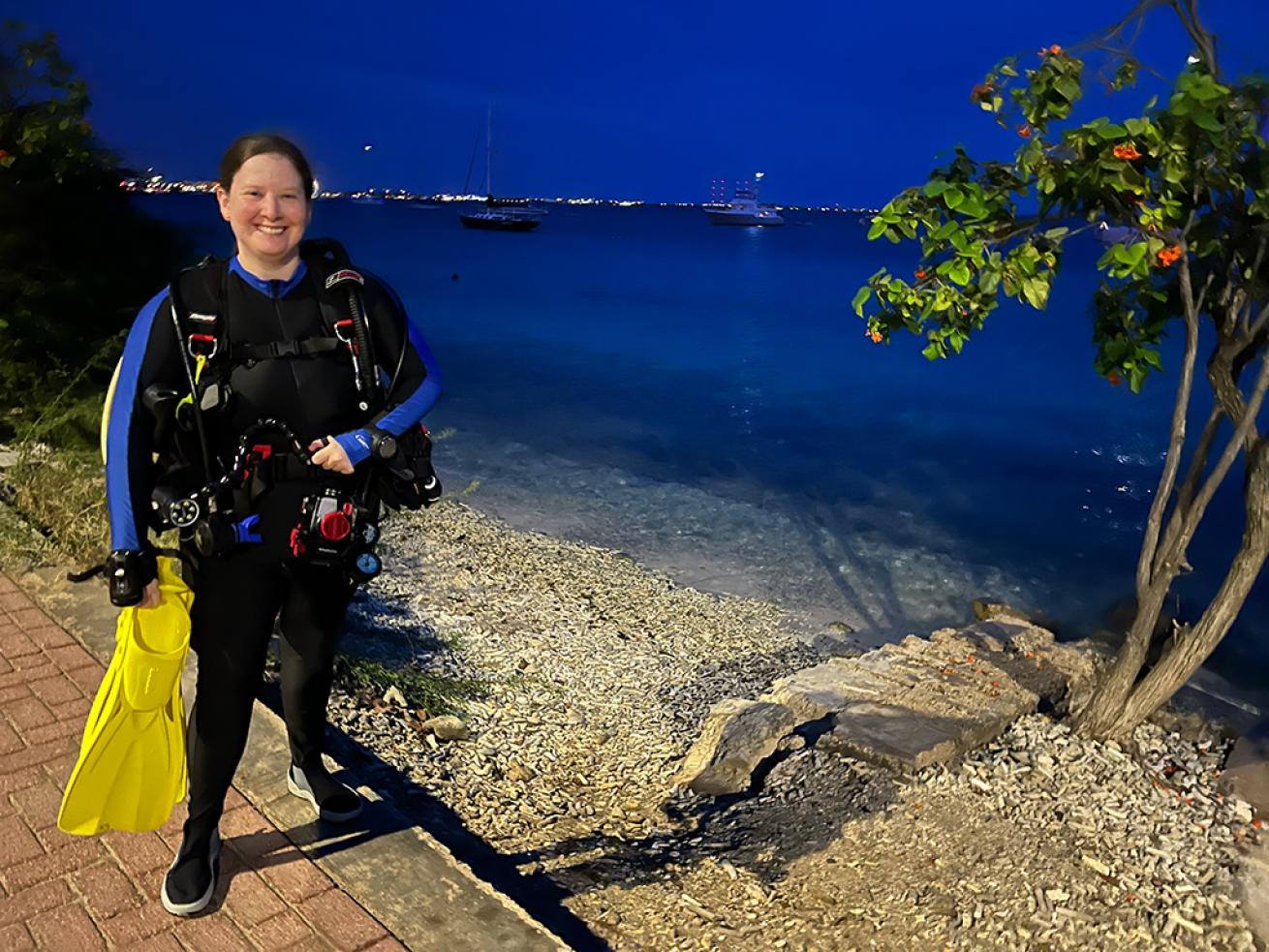 Alexandra OwensThe author preparing for a night dive in Bonaire