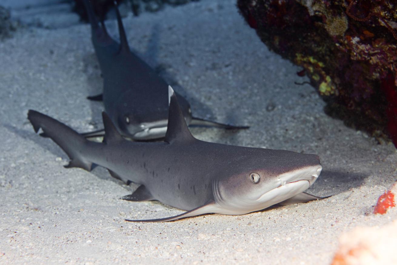 David FleetmanWhitetip reef sharks rest beneath a ledge at Black Rock