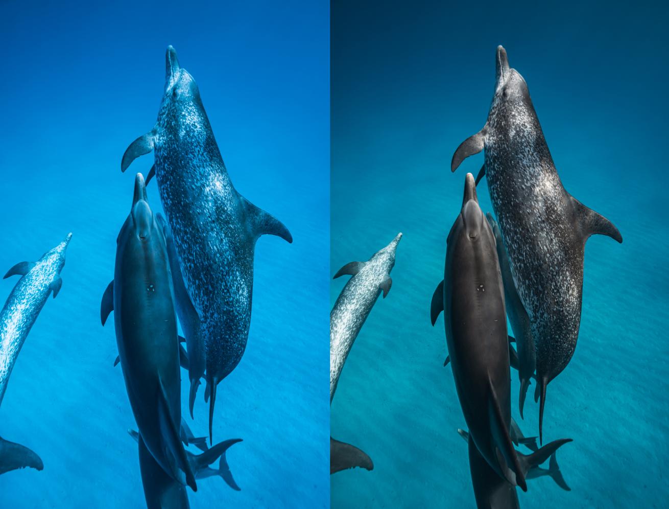 Jay ClueThe only difference between these two panels is the white balance setting. The left panel shows what the dolphins look like using auto white balance at roughly 20 feet/6 meters underwater, the right panel shows the same shot using custom white balance.