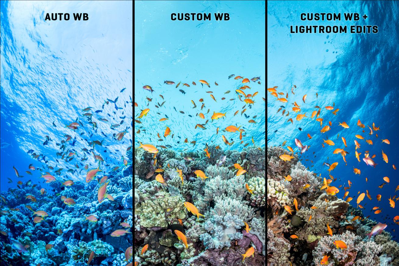 Now I can already hear you asking, why would I mess around with custom white balance on my camera if I can just shoot RAW and adjust it later? Well, if you correct in camera, you’re going to have a much easier and faster editing session later—especially when shooting silvery or gray subjects or in the open ocean. Why? Because if everything in the image is similar shades of blue, then when you set a target neutral in the software, everything changes, including the water.