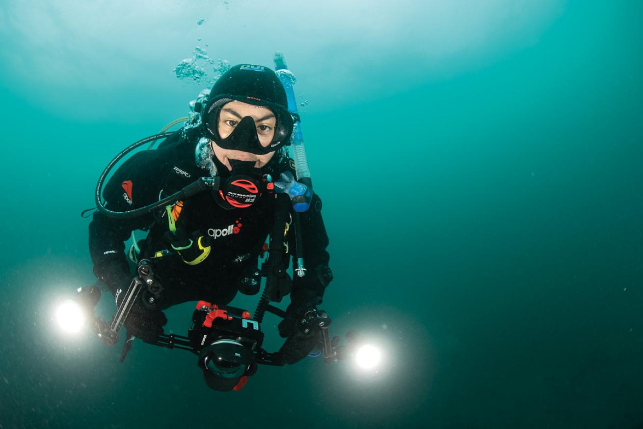 Annie CrawleyIf you plan to use a camera with your drysuit, make sure you’ve already mastered dumping air before adding another element. If you lean too far forward and down, air will go to your feet.