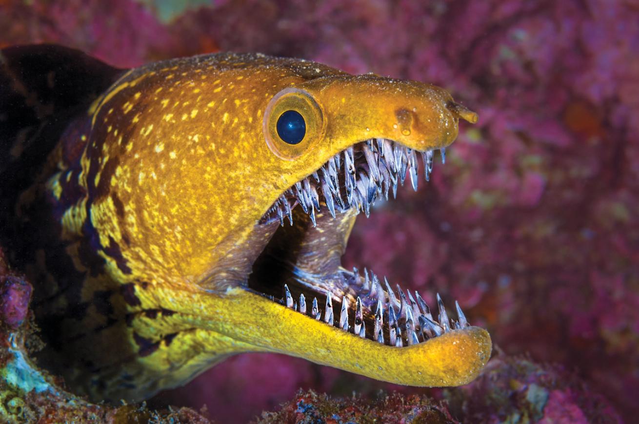 1 Seek out species with prominent teeth, like this fangtooth moray in the Canary Islands, and then time your shot for a fully open mouth to show them off. Darker individuals are best because their pearly whites stand out more in their dark mouths. When possible, I will pull my strobes wider apart for these shots to rim-light the eel, throwing most of the mouth into shadow and making the teeth really jump out.