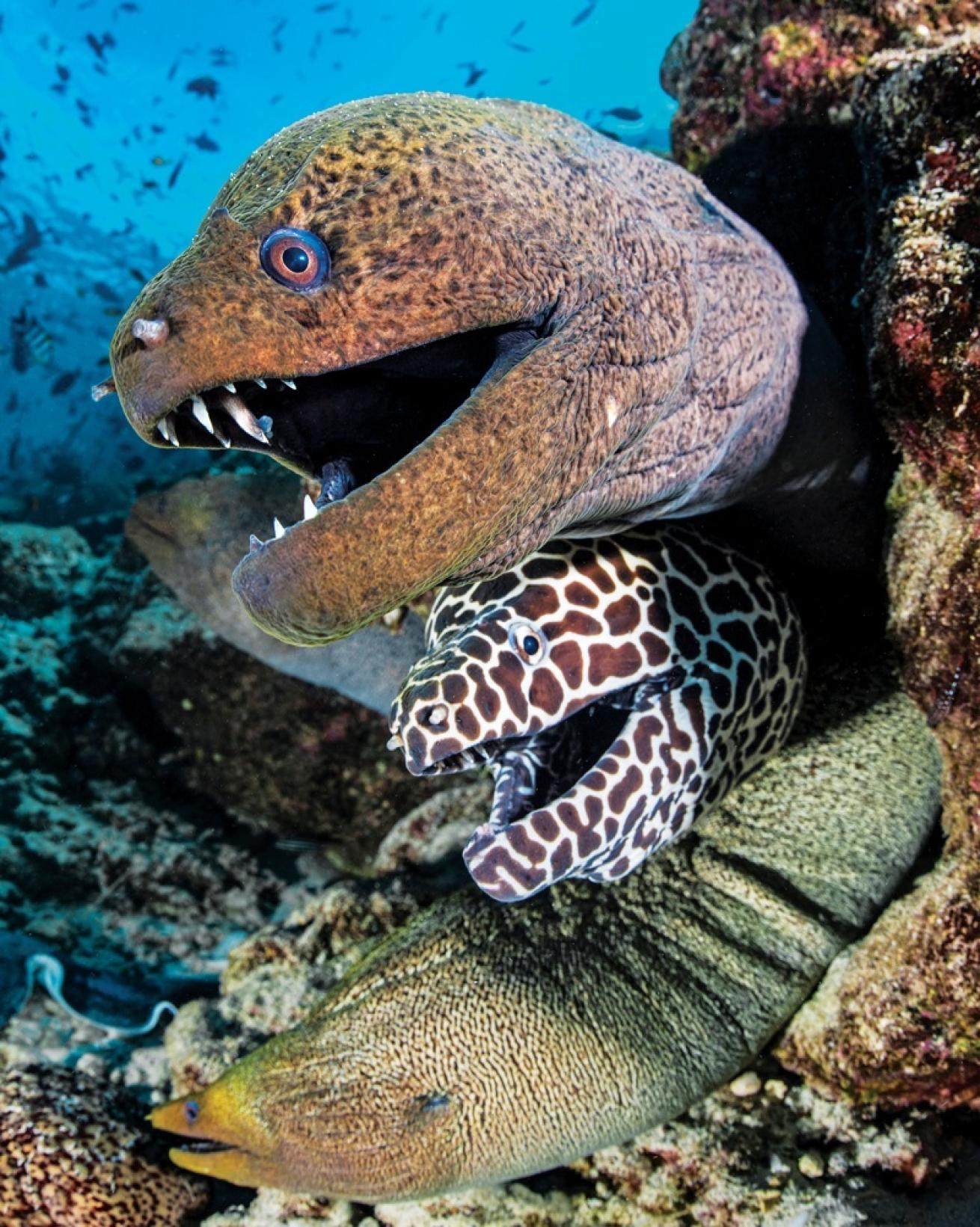Despite these challenges, eels usually stay put, allowing you to aim a snoot or maneuver the camera in for a wide-angle close-up. Morays are often social, with several individuals crowding in a hole together. Many species have attractive patterns, and moray eels have especially impressive teeth.