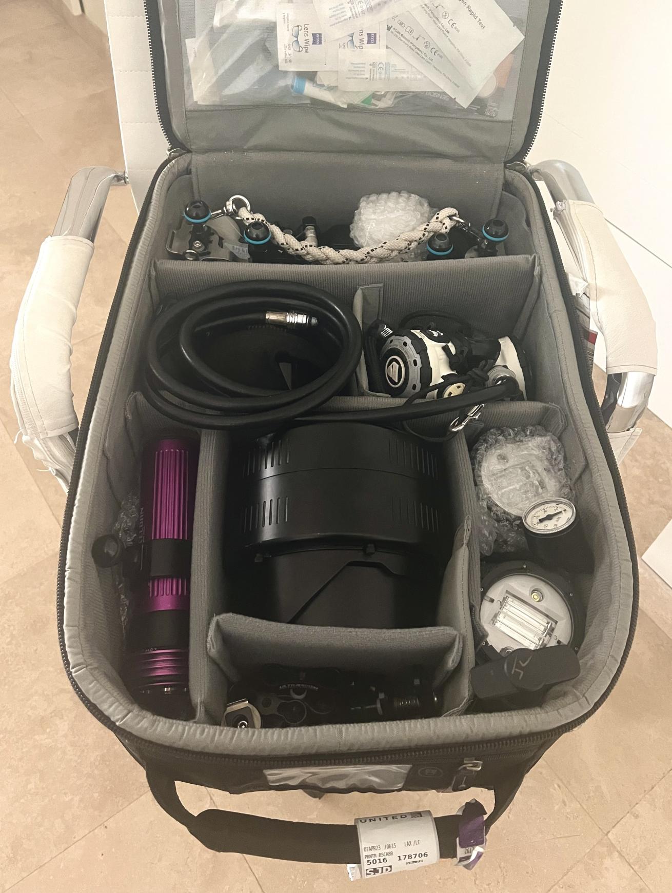 Jay ClueThe Think Tank Airport Security is technically carry-on size yet holds a ton of gear safely. As pictured it holds a Nauticam NA-A1 housing, a Nauticam WACP-1, a Nauticam 180mm glass dome, two Keldan 8XR video lights, two Sea & Sea YS-D3 Mk II strobes, a set of Apeks MTX-R regs plus some miscellaneous clamps and hardware.