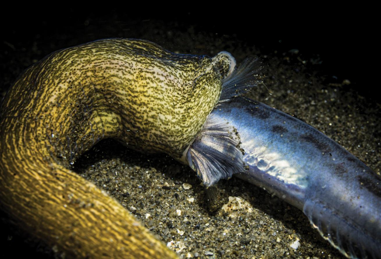 The dust settles, the victim squirms a little bit and then not at all as a smooth, greenishyellow, pinstriped… tube of some sort crawls its way up the goby’s body, the creeping muscular monster whipping violently with the fish’s final spasms before the murderous maw disappears beneath the sand without a trace, returning the seafloor to an eerie stillness.