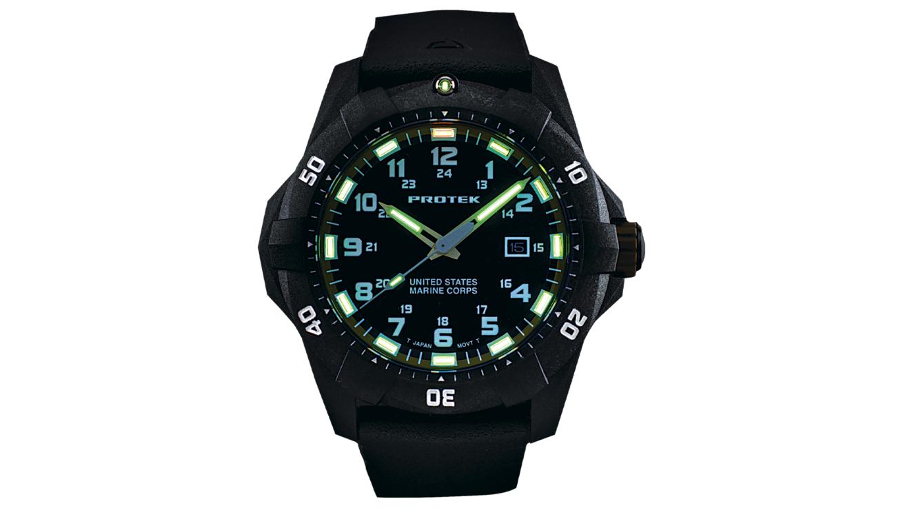 The ProTek USMC’s lightweight comfort and excellent legibility quickly made it one of my go-to watches for diving and daily wear. The bezel, while easy to operate underwater, has a thin, low-profile design that won’t snag when you’re up to your elbows in gear. The watch’s durable construction allows you to focus on the task at hand without having to babysit it when it’s on your wrist—a huge benefit when kitting up with heavy, bulky scuba gear. Capable of withstanding extreme abuse, comfortable enough to be worn for any duration and with legibility for any conditions, it’s no wonder ProTek has been chosen to serve among the few and the proud.