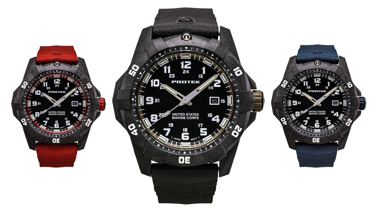 ProTek’s latest collection celebrates the brand’s recognition as an official watch of the United States Marine Corps (USMC) following a rigorous assessment of their watches’ durability, accuracy and quality. The nine-model collection includes red, blue, green and desert colorways in official USMC pantones and one model with a blacked-out dial.
