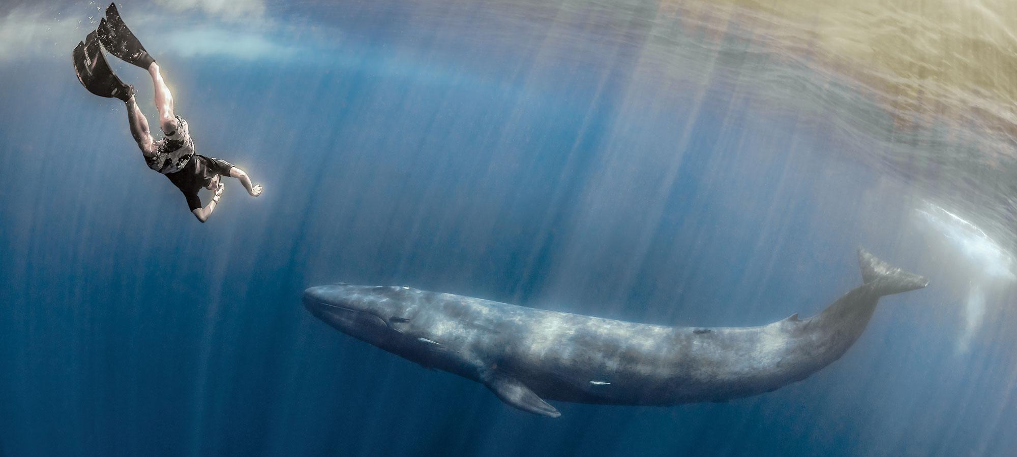 Tobias FriedrichFreedivers must carefully enter the water and cause little disturbance when interacting with blue whales in the water.