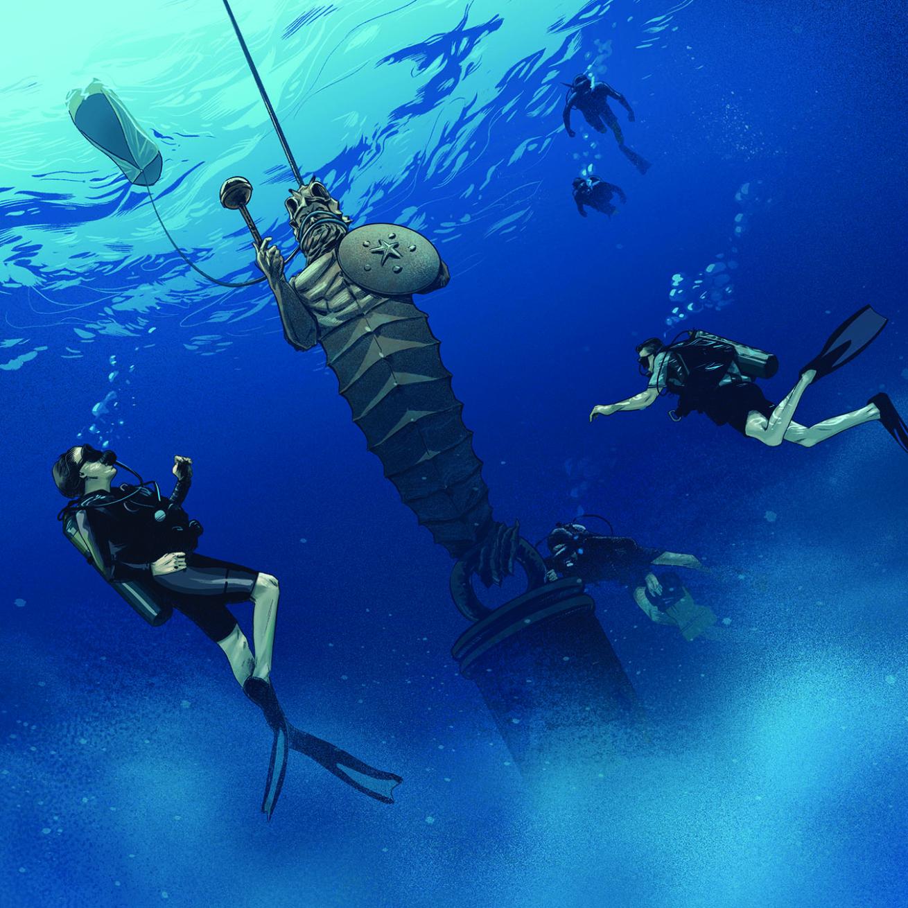 Guardian of the Reef — a mythological creature that’s half ancient warrior and half seahorse — has been 10 years in the making. It’s traveled 4,552 miles, from a studio in British Columbia, Canada, to Grand Cayman. Its last land leg was an I-can’t-look journey: strapped atop a truck, driven from Divetech’s Lighthouse Point location to George Town’s harbor, lowered into the water, attached to heavy-duty lift bags, and then towed by a small boat back to Lighthouse Point. A circuitous route, but neither the concrete base nor bronze statue could be dragged out from the Lighthouse Point shallows.