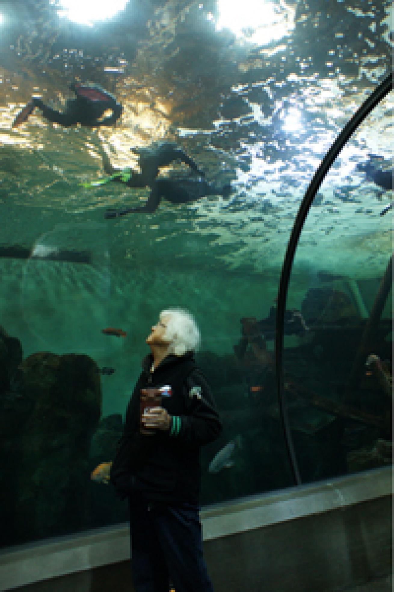 participating in feeding fish in Halibut Flats, or descending past the observation ledge to the bottom of Open Sea and circumnavigating the exhibit with the sharks.