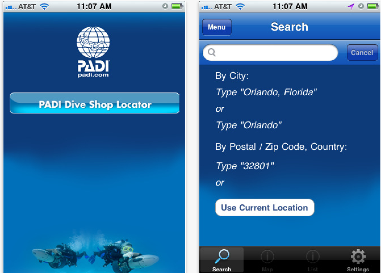 Description: A PADI Dive Center and Resort locator app that contains contact information and Five Star status for PADI Dive Centers and Resorts and is designed to locate all PADI Dive Center and Resort locations around the world.
