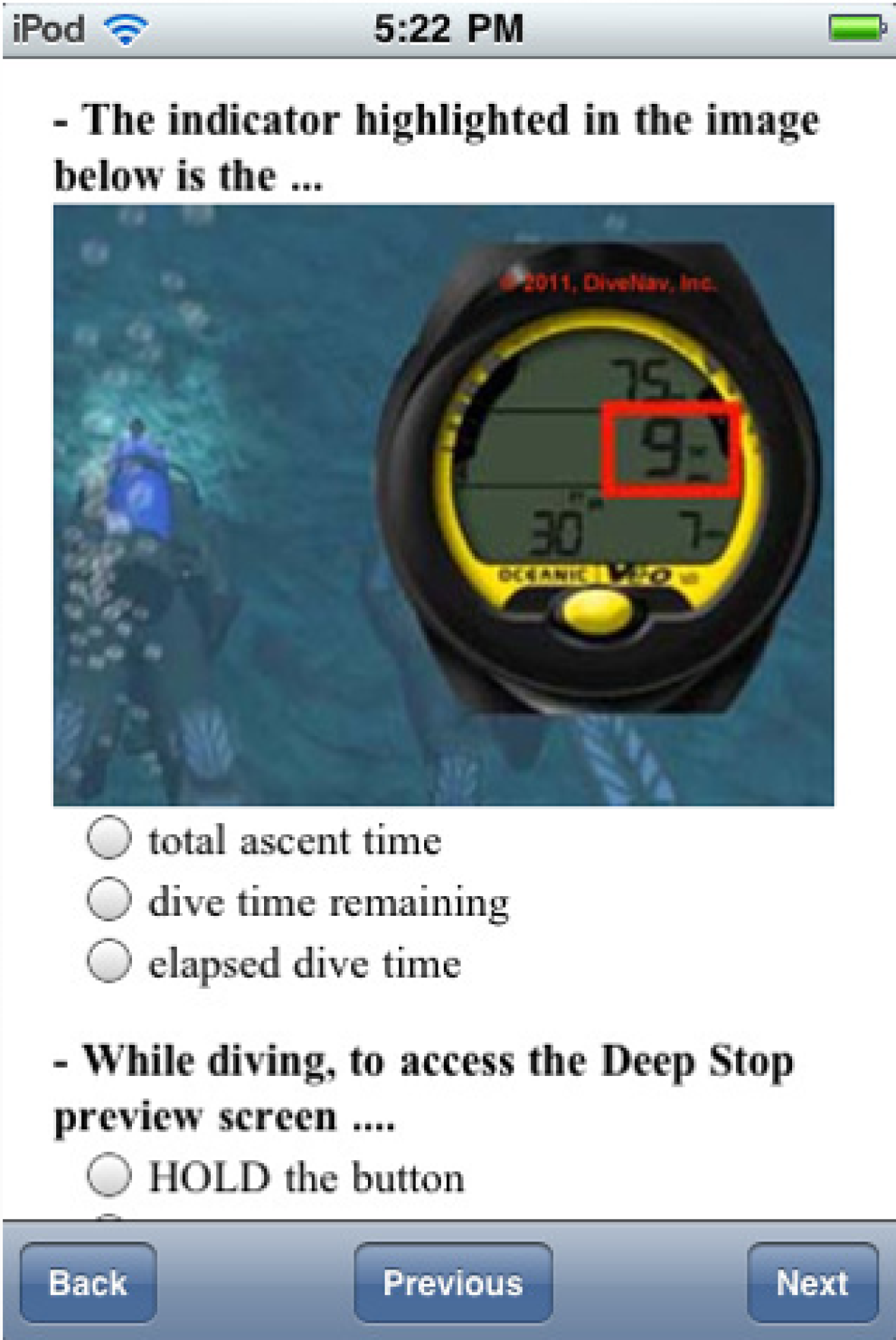 Pros: Informative, well laid-out training videos are both challenging and allow you to learn at your own pace. There are also many computer-training options. Many dive computer manufacturers have modified versions of this application dedicated to their dive computers.