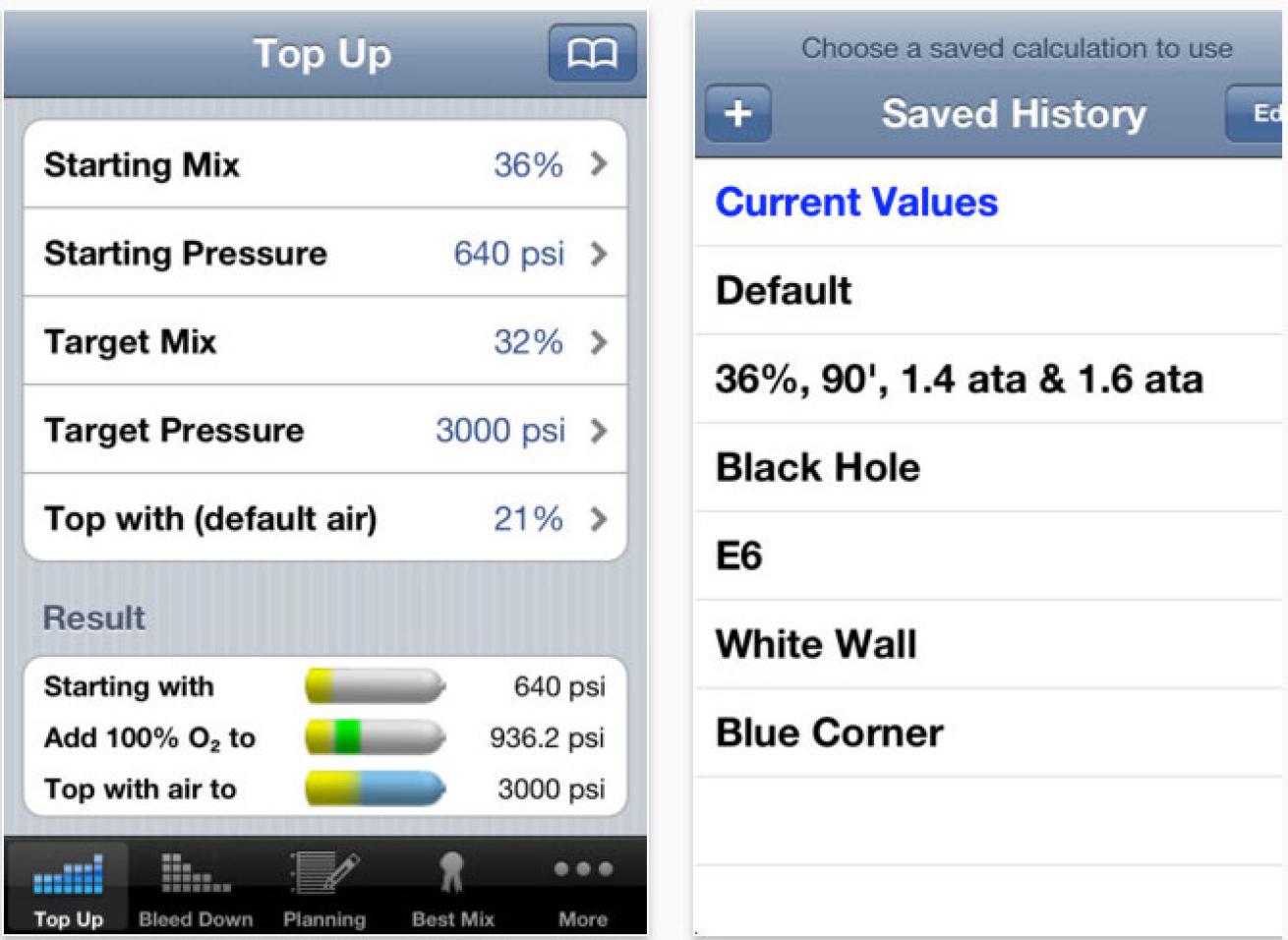 Bottom Line: At $5.99 I think this is a great app for every dive shop employee that performs gas fills. Although it happens rarely enough, I’ve gotten my share of tanks from shops that cannot provide you with an accurate fill. This app eliminates the guessing and, in a very quick and easy way, calculates the right blending of gases and avoids having to rely solely on all the old-fashioned math we learned back in high-school chemistry and math classes. Every mix we attempted to “blend down” or “top up” came to within 5-6psi of actually making for a mix that was within 1% of our target O2. The only downside to this app is that you can’t print your results. For more common fills it would be nice to have printouts hanging on the wall next to the fill station.