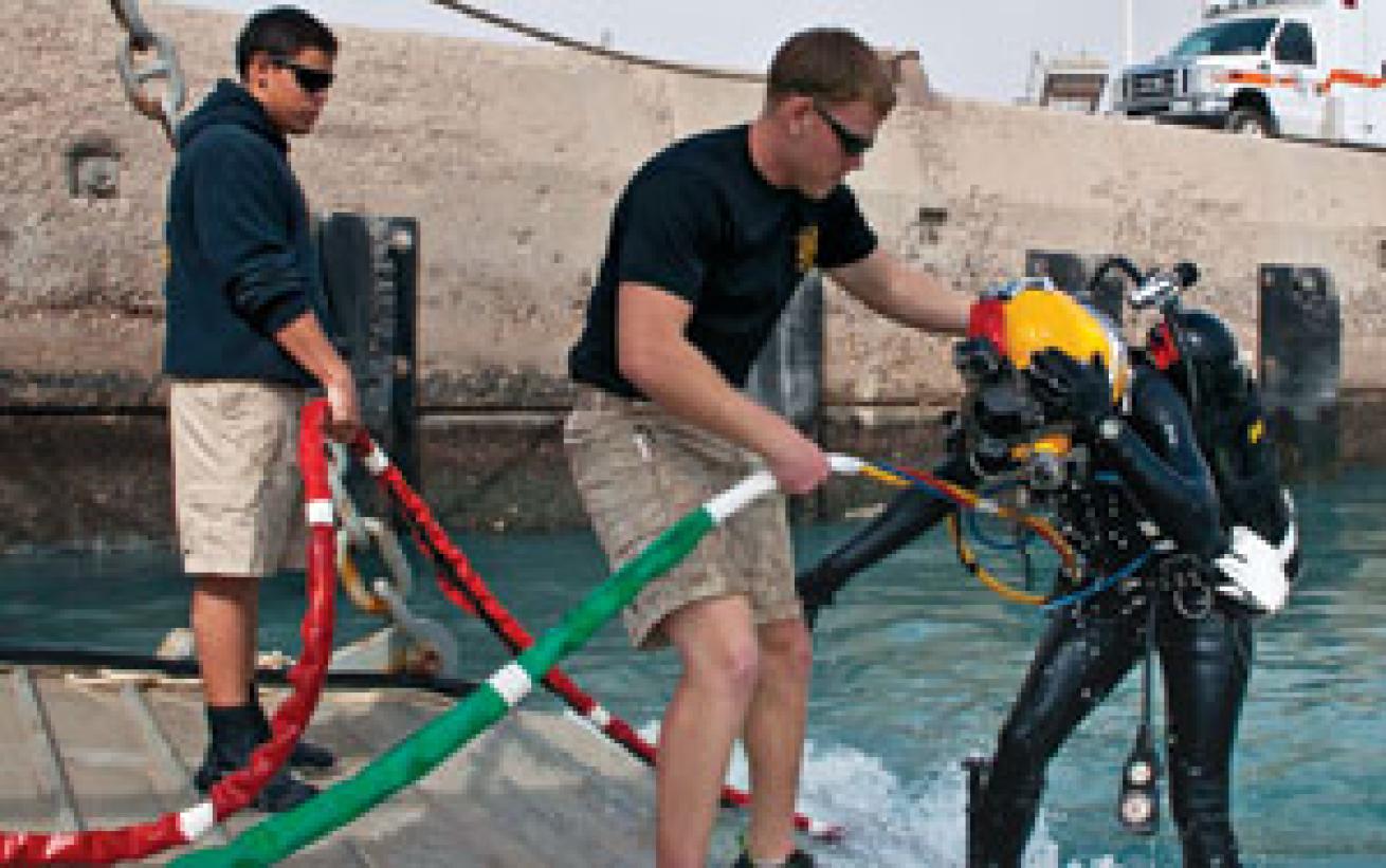 Another training exercise that emphasizes the importance of physical fitness is our two-week annual Deep Blue. One day the seas picked up — waves grew to 5 feet. While wearing a 30-pound dive helmet, a standard scuba tank, weights and boots, I had to hoist myself onto a platform. Then as a unit, we had to pull the rest of the crew from the drink. We were maneuvering around 2 tons of steel slapping up and down in the waves. If we didn’t muscle up the strength to ride the swell, we would have been endangering ourselves and our surface support — they could have been swept under and injured by the bow ramp.