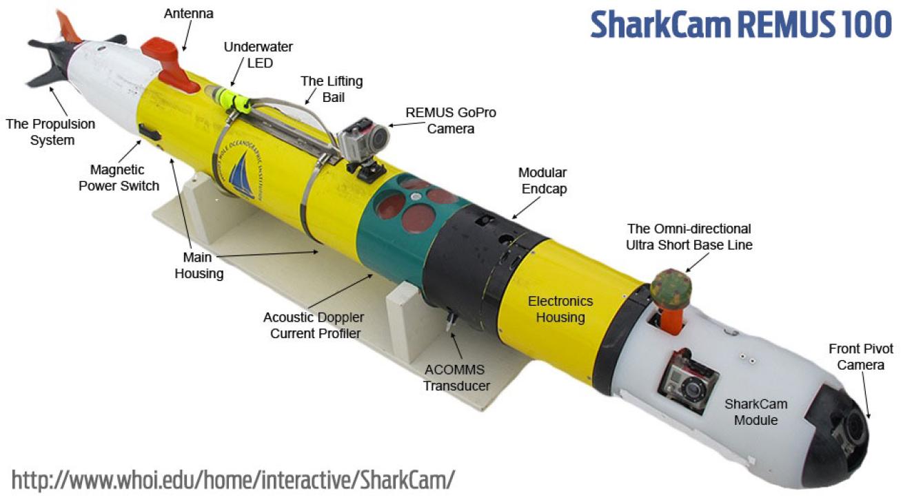 Sponsored by Discovery Channel, the torpedo-shaped robot captured amazing footage of a great white shark displaying what appears to be predatory behavior. REMUS-100 was created by the Woods Hole Oceanographic Institute and is equipped with a navigation system, acoustic sensors, GPS, WiFi, temperature probes and 6 GoPro video cameras, according to Discovery News.
