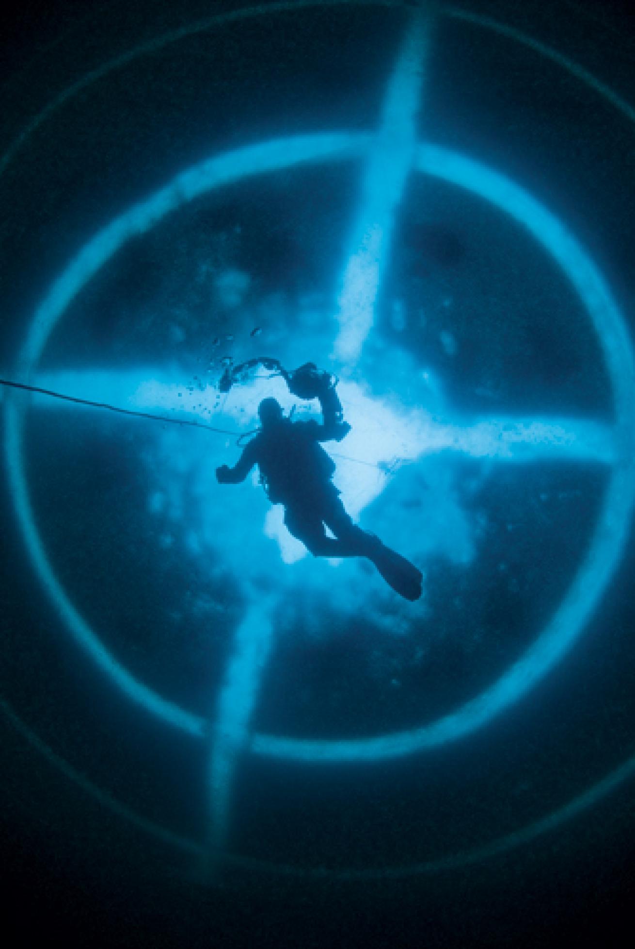 This was taken during an ice dive in a freshwater lake. The air temp was around 14 degrees F, but the water was nice and warm — 39 degrees. Looking up, I saw my buddy coming down; the circles are markings in the snow to lead us if we lose our safety line.
