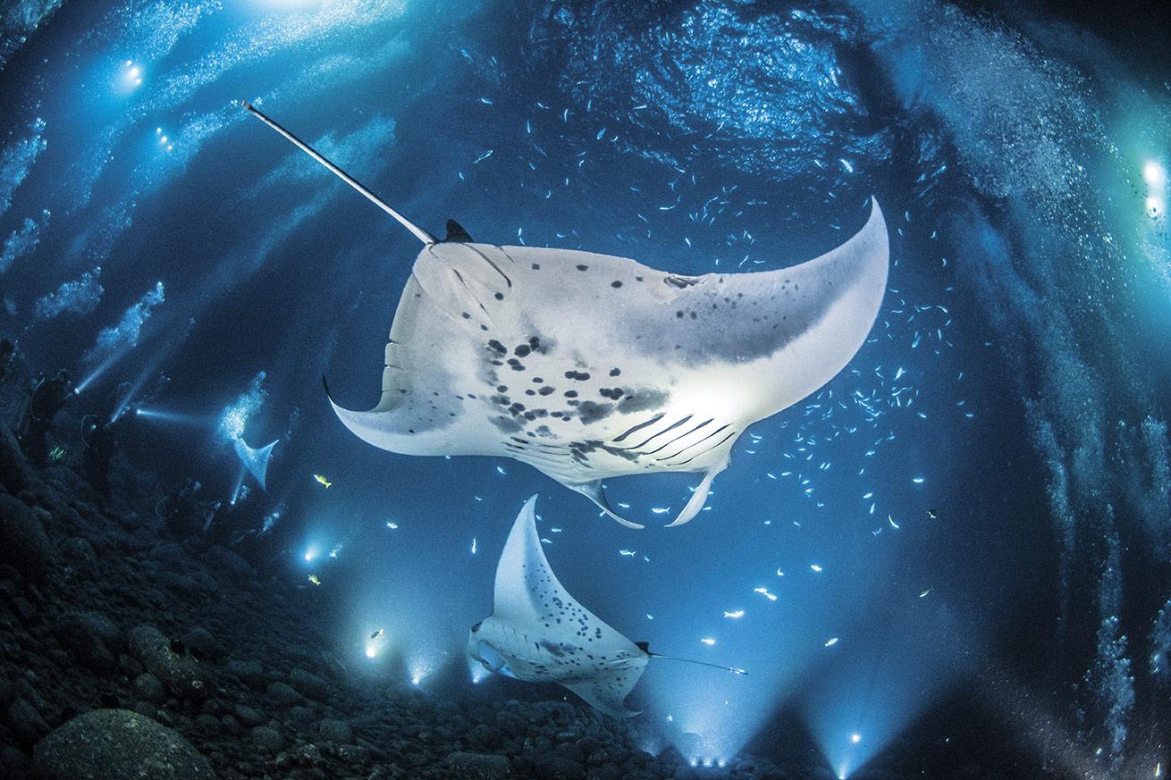Jason SintekDivers gather around in a circle with strong lights, similar to a campfire setting, to attract manta rays.