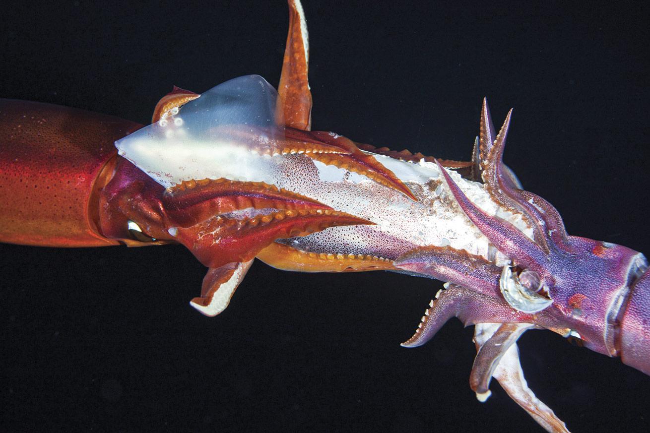 Jeffrey MilisenDivers can witness squid cannibalism during an adventurous night dive.