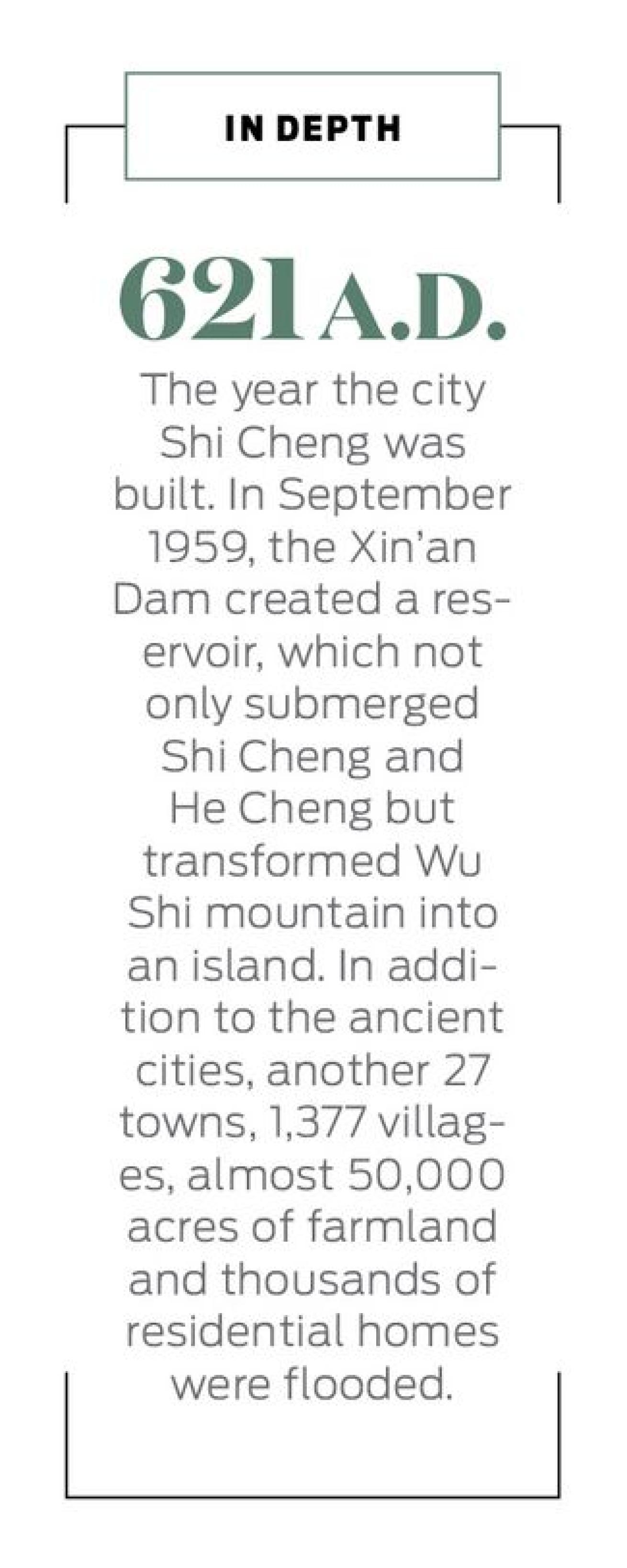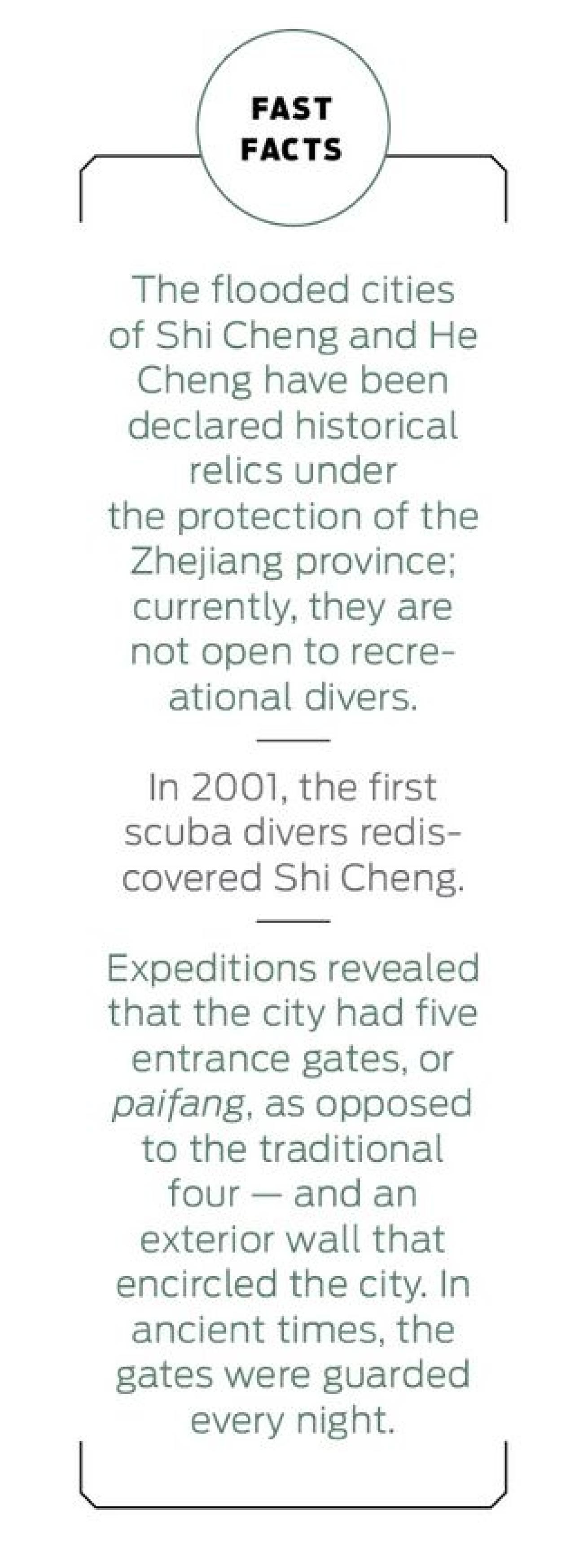 For more than 50 years, Shi Cheng — a maze of white temples, memorial arches and houses decorated with classical Chinese statues such as guardian lions and intricate carvings of dragons and phoenixes — slumbered undisturbed at the bottom of the Qiandao Lake until it was rediscovered in January 2001 and later declared a historical relic under the protection of the Zhejiang province.