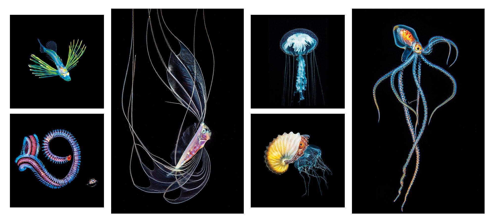 Blackwater photography is addictive; you never know what you will encounter. This female paper nautilus, Argonauta hians, is actually a pelagic octopus. It can move extremely fast, making it potentially hard to shoot. Some I had to follow to 120 feet, trying to keep up; others I got to spend 10-plus minutes with. The greatest challenges of black-water photography are locating subjects, framing and focusing on small critters in open water, and even just keeping track of the subject while shooting, as they can vanish into the darkness as you remove your eye from the viewfinder to review your shots! —ALEX TYRRELL