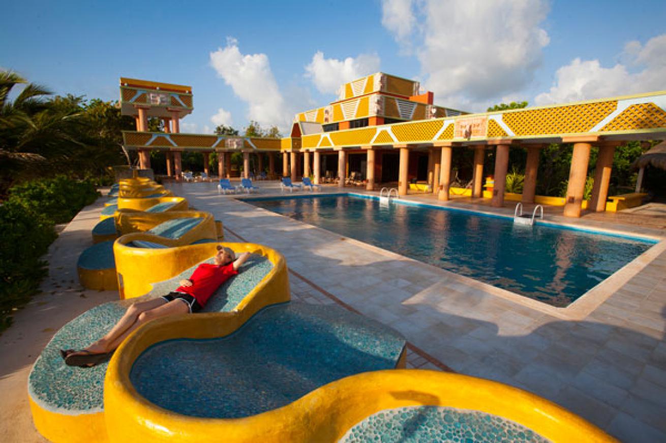 Guests know the moment they enter the Maya Palms Beach Resort they have arrived somewhere special. As they walk through the grand gates they feel as if they left their life behind. This tropical hideaway is located on the Mexican Caribbean known as the Costa Maya Riviera. In addition to the virgin diving on the Mesoamerican Barrier Reef guests can enjoy other activities such as shopping, horseback riding, and ruins tours. Divers and nondivers alike will love this beautiful eco resort, featuring boutique accommodations. After diving the secondlargest barrier reef in the world, step off the dive boat to your own private tropical getaway. Then go for a swim in the freshwater pool or ocean and relax on the custom bling bling loungers next to the sea. After the evening meal stroll through the gardens and ascend the four-story Mayan pyramid restaurant — see the panoramic view of the ocean, watch the sun set over the vast jungle and observe as the ocean of stars materialize, and that's just the end of a day at Maya Palms “where the jungle kisses the sea.” This away-fromit- all resort recharges your soul. Divers will find the scope and majesty of the reefs get better the closer they look, with rare sea life such as clown crabs and inch-long seahorses. Porpoises, spotted eagle rays, sea turtles and dolphin encounters are common. Access to over 100 dive sites are only a 5-15 minute boat ride away from the resorts beach. Topside explore the ruins of Kohunlich and Chacchoben, kayak or savor a traditional Mayan cuisine. This is the last of the “rustic Caribbean,” a place that is just beginning to capture the imagination of dive travelers. It's a mostly undiscovered adventure waiting to be explored from a modern eco beach resort that caters to discriminating divers and travelers.