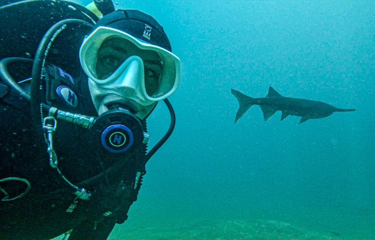 Ischa takes a selfie with a paddlefish.