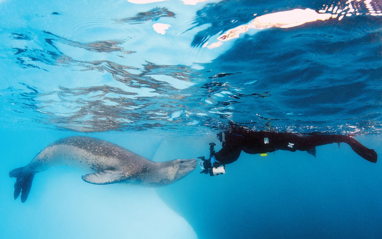On a shoot in Antarctica, Jones found himself in the water with a leopard seal that didn’t know the meaning of personal space, lunging within inches of the lens and retreating. Ever the pro, Jones relied on a trick or two. “I quickly flipped the strobe arms in close, knowing I would get coverage if the seal came in close, which it did. And then I prayed.”