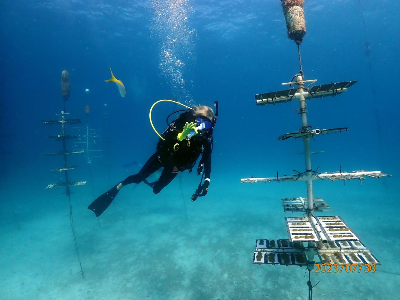 Ken NedimyerSarah Fangman checking on a Mission: Iconic Reefs coral nursery in Florida Keys National Marine Sanctuary.