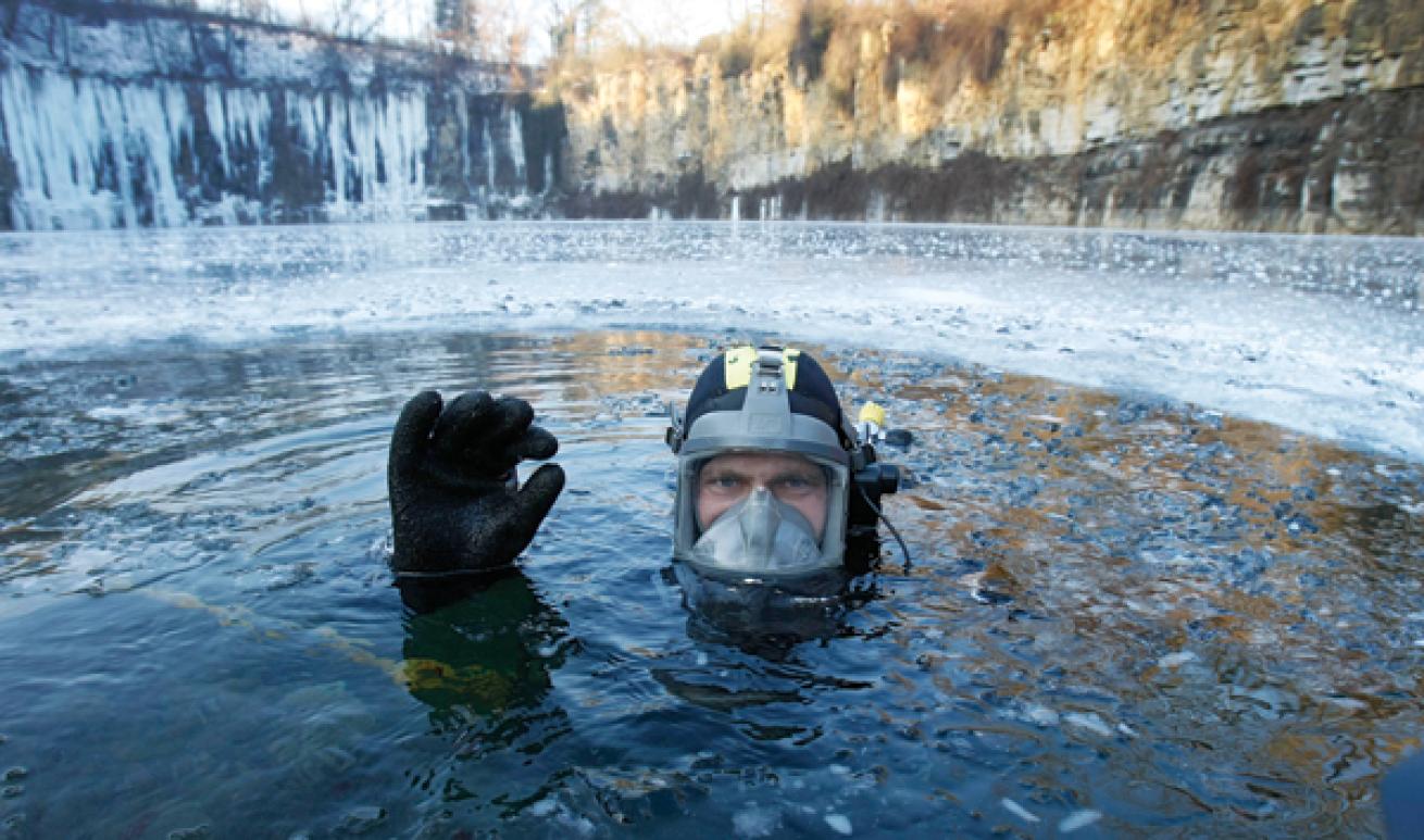 Before I enter, I look back toward the shore. I can see the family standing in a cluster, looking out at the search line marking-buoy. They’re looking at me. Under the buoy is one end of my line, which is anchored at both ends and helps me to make a more organized search. Somewhere on the bottom, in this area several acres wide, is the body of a drowning victim. Three of my teammates have moved the line through the search area and the last out carried a boot he found before his air ran low. It’s my turn.