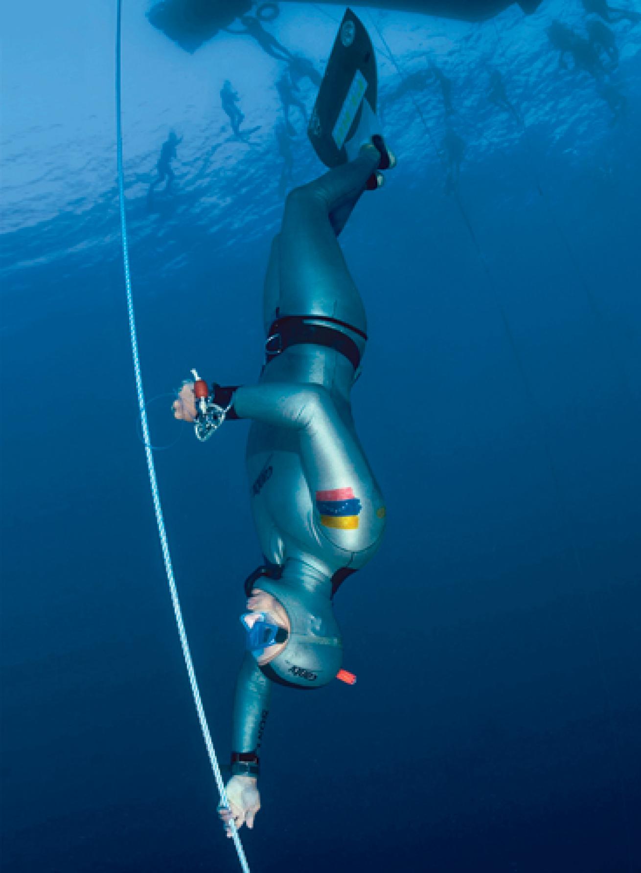 0 feet I reach the surface and grab a rope — it’s not just so I can steady myself as I suck in a lungful of air, it’s also surface protocol for the judges. After catching my breath, I reflect on my accomplishment: After 3 minutes 51 seconds, and a 761-foot round-trip on a single breath, I have set a new Panamerican record!