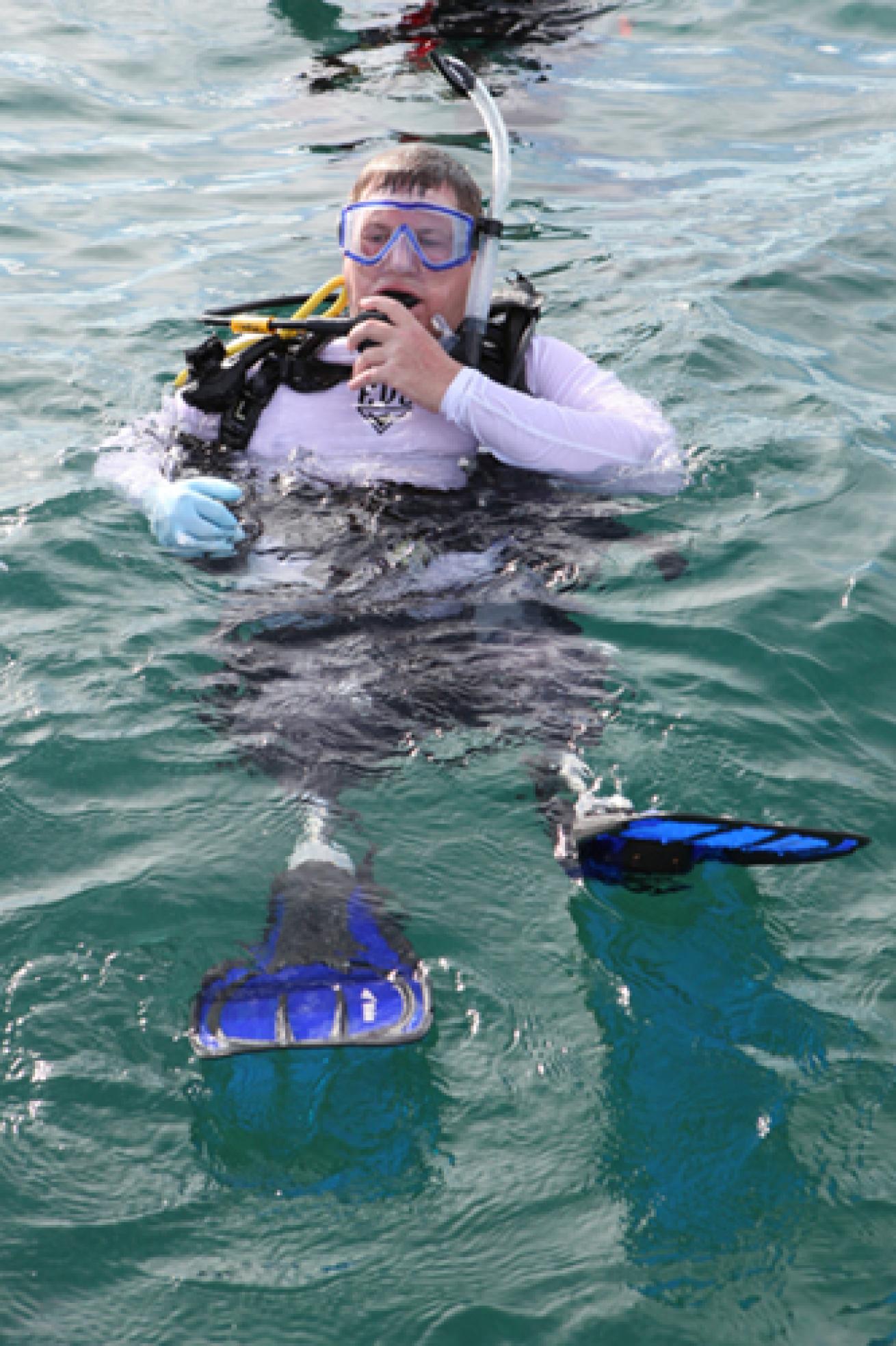 The injuries to my right arm required me to rig the hoses a little differently, so I could reach everything with my left arm. I also had special sockets for my prosthetics made so I could attach a foot that would work with my fins. Using basic prosthetic technology, they created an articulating joint that I could lock into the toes pointed position necessary for swimming. The upside to this is that finning is really easy now. I thought I’d have difficulty but I was able to fin perfectly. You just have to adapt to what you can do. It’s all part of getting back out there. The part you don’t realize is just how bottom heavy humans are. Without my legs, I had a tendency to flip over in the water, like a fishing bobber. I had to learn to compensate by using my core muscles to hold my position. The effort was exhausting. Every time I dived it completely wiped me out. We were doing two-tank dives and even though I thought I would be an air hog, I was glad to find out I wasn’t, which made me feel great.