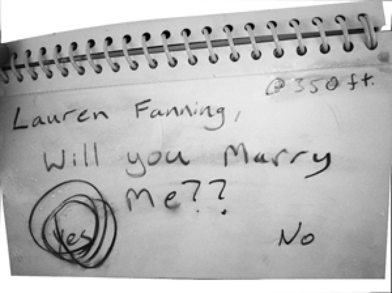 Then Jon turned around and presented a slate to me. On it,I read the words, "Lauren Fanning, Will you marry me?" Plus, my options,"yes" and "no." I had to read it twice to make sure I wasn’t seeing things. When I realized what was happening, I jumped on top of him laughing (while breathing helium and sounding like a chipmunk and laughing even harder because of that), and all the while my mask is completely flooded. He calmed me down and presented the slate again (I got too excited to circle yes, or no). I finally circled yes, over and over again. By now it was time to ascend and start decompressing. We switched from having a fun, romantic, crazy moment to being serious and having a duty to fulfill. I can't really imagine what decompressing face to face with Jon for 70 plus minutes would be like had I said no! I will say that deco went by very fast, and we surfaced to an entire boat full of people yelling, "Congratulations!"