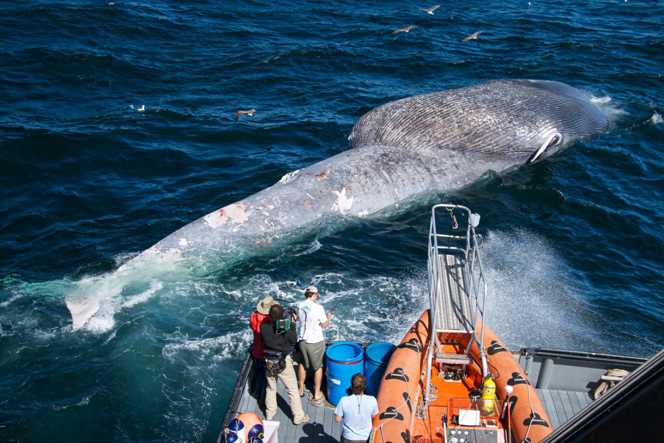 Melissa GaskillResearchers examine a blue whale killed in a ship collision on the West Coast.