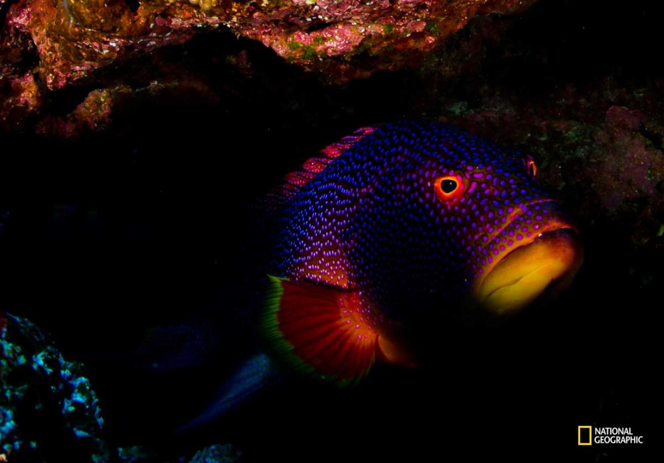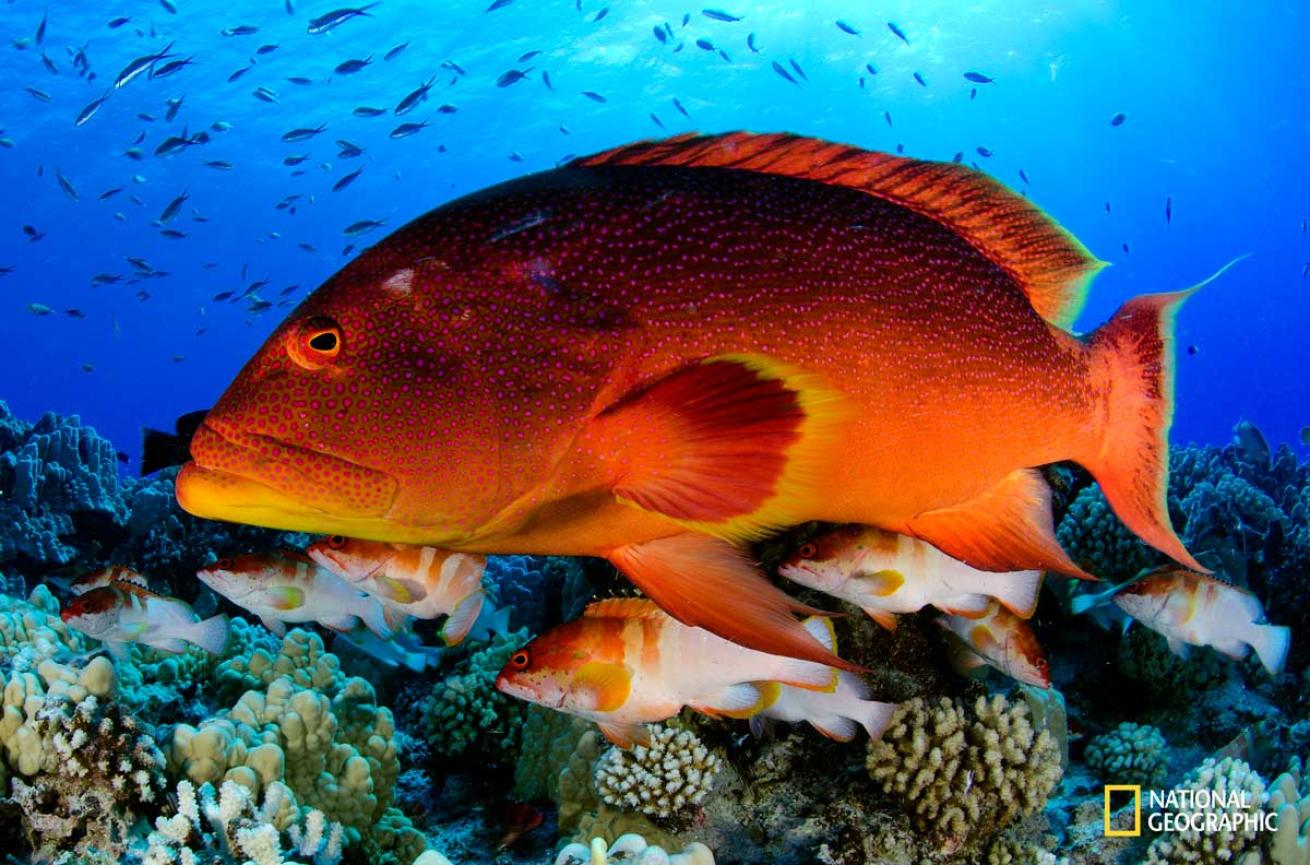 Photo by Enric Sala/National GeographicThe groupers Variola louti (red and yellow) and Epinephelus fasciatus on the fore reef of Oeno Atoll followed the Pristine Seas divers underwater for two hours during a 2012 National Geographic expedition to the Pitcairn Islands.